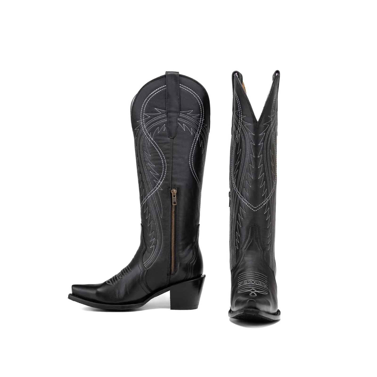 Black Snip-Toe Half-Zip Double Embroidery Knee High Cowgirl Boots.