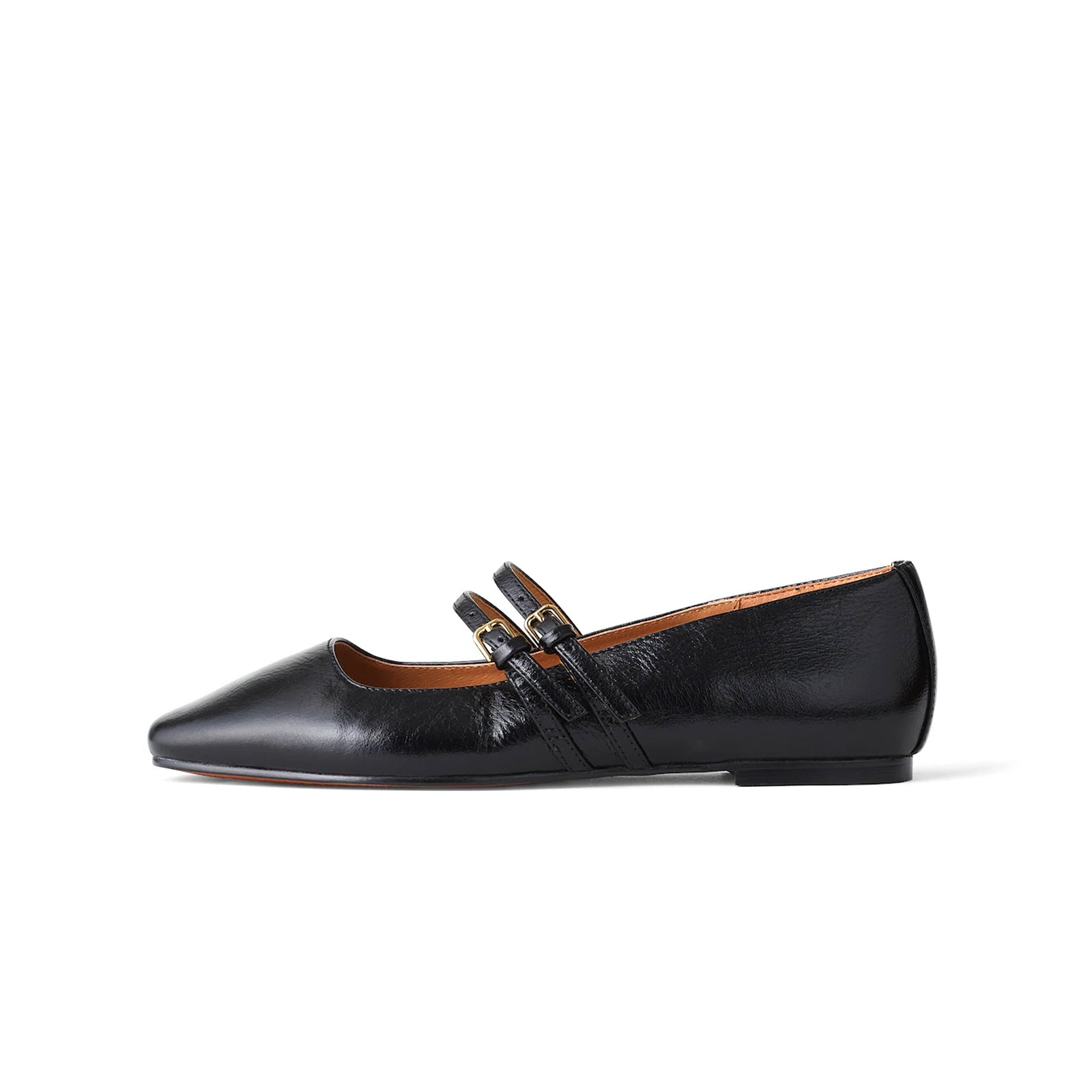 Black Square-Toe Double Buckle Bridge Strap Flats.