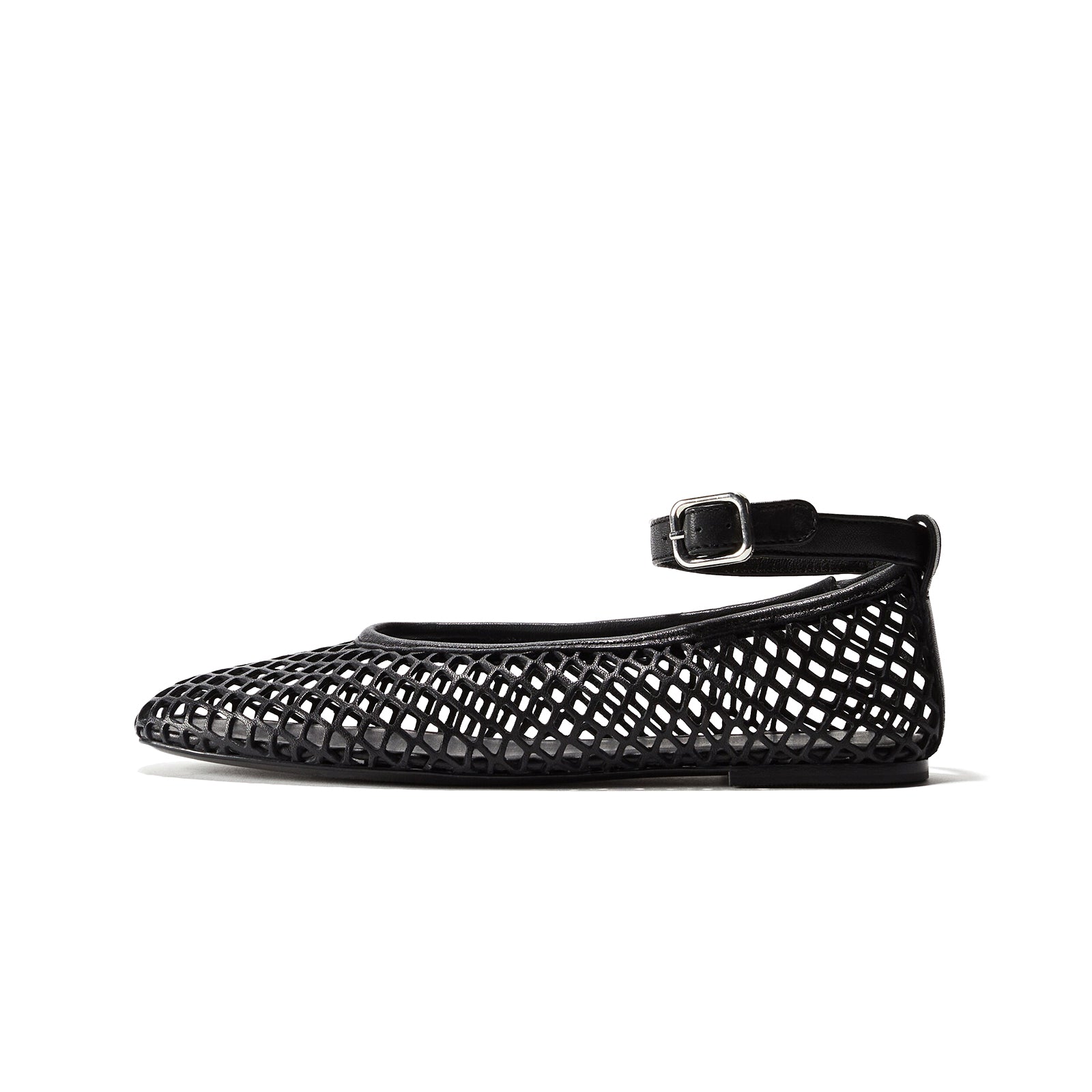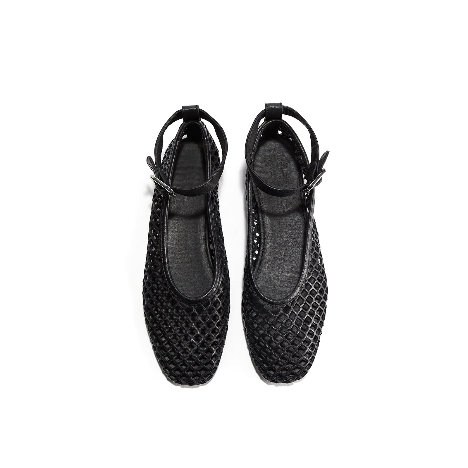 Black Square-Toe Perforated Ballet Flats With Ankle Strap