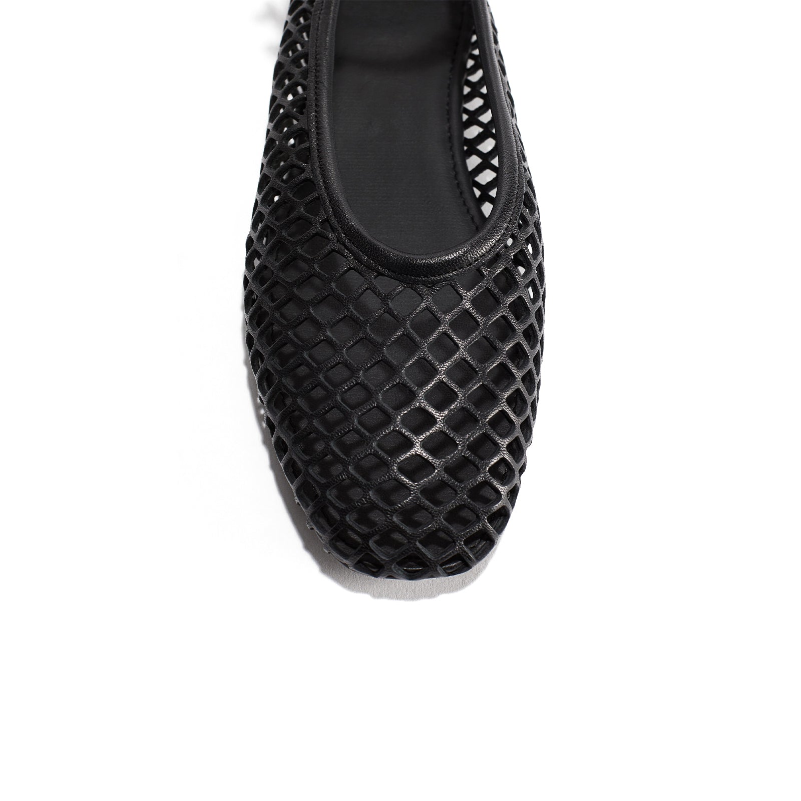 Black Square-Toe Perforated Ballet Flats With Ankle Strap.