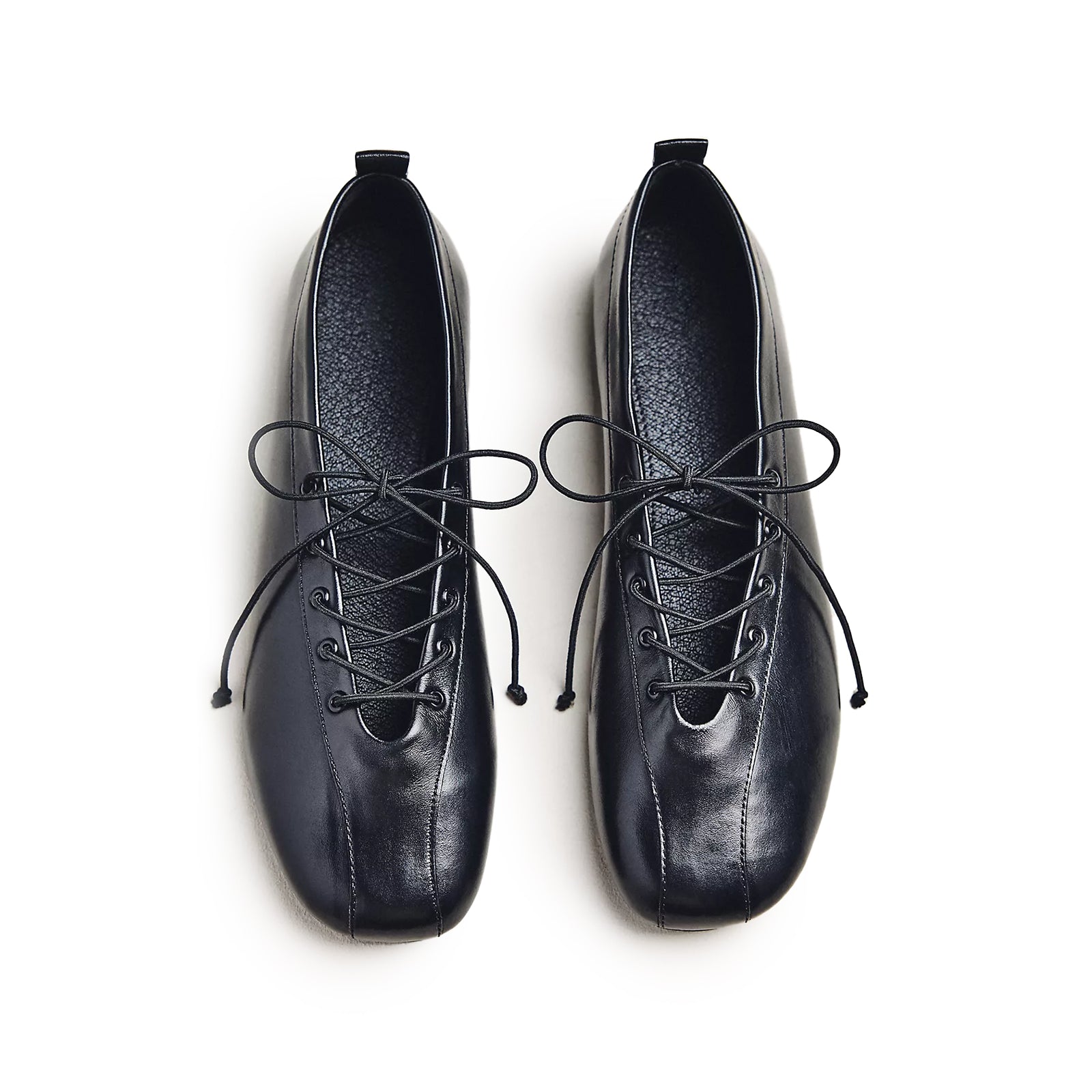 Black Vegan Leather Square-Toe Lace-Up Ballet Flats.