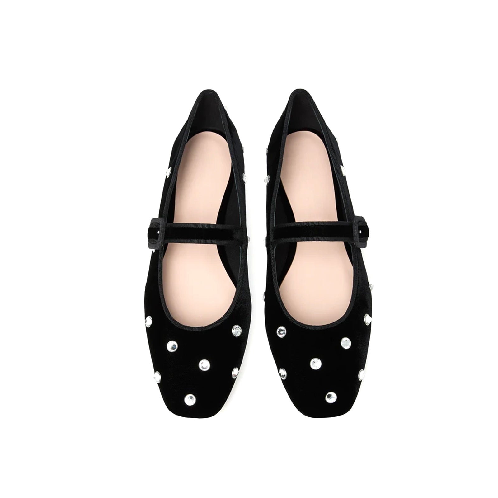 Black Velvet Square-Toe Bridge Strap Ballet Flats With Rhinestones.