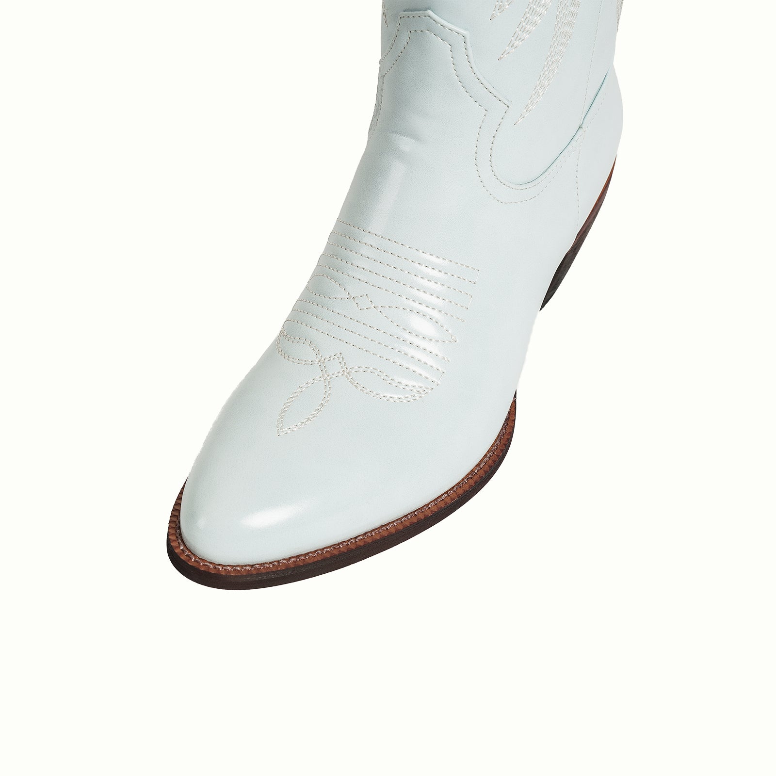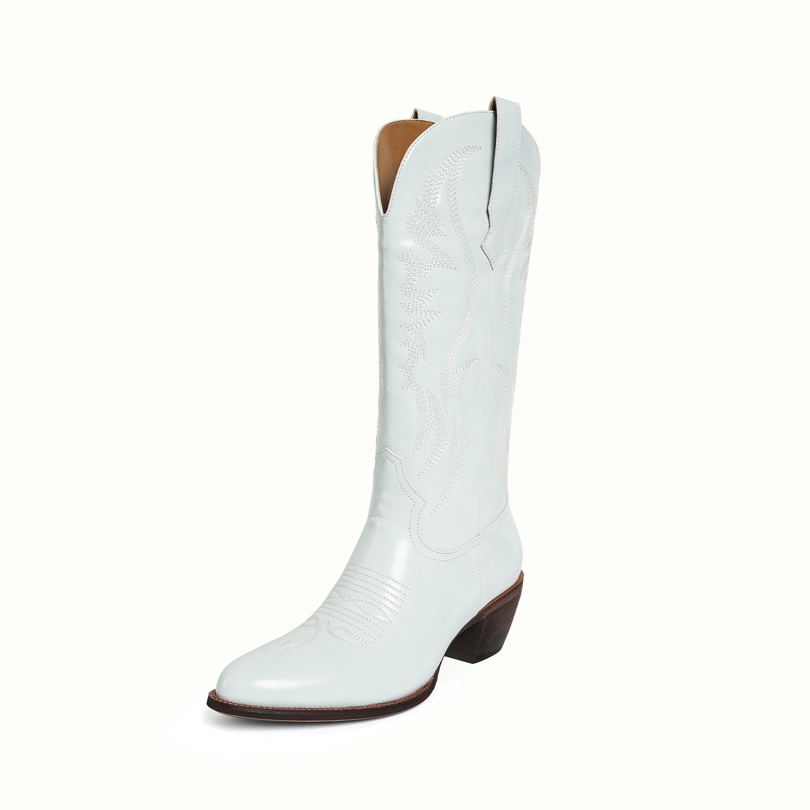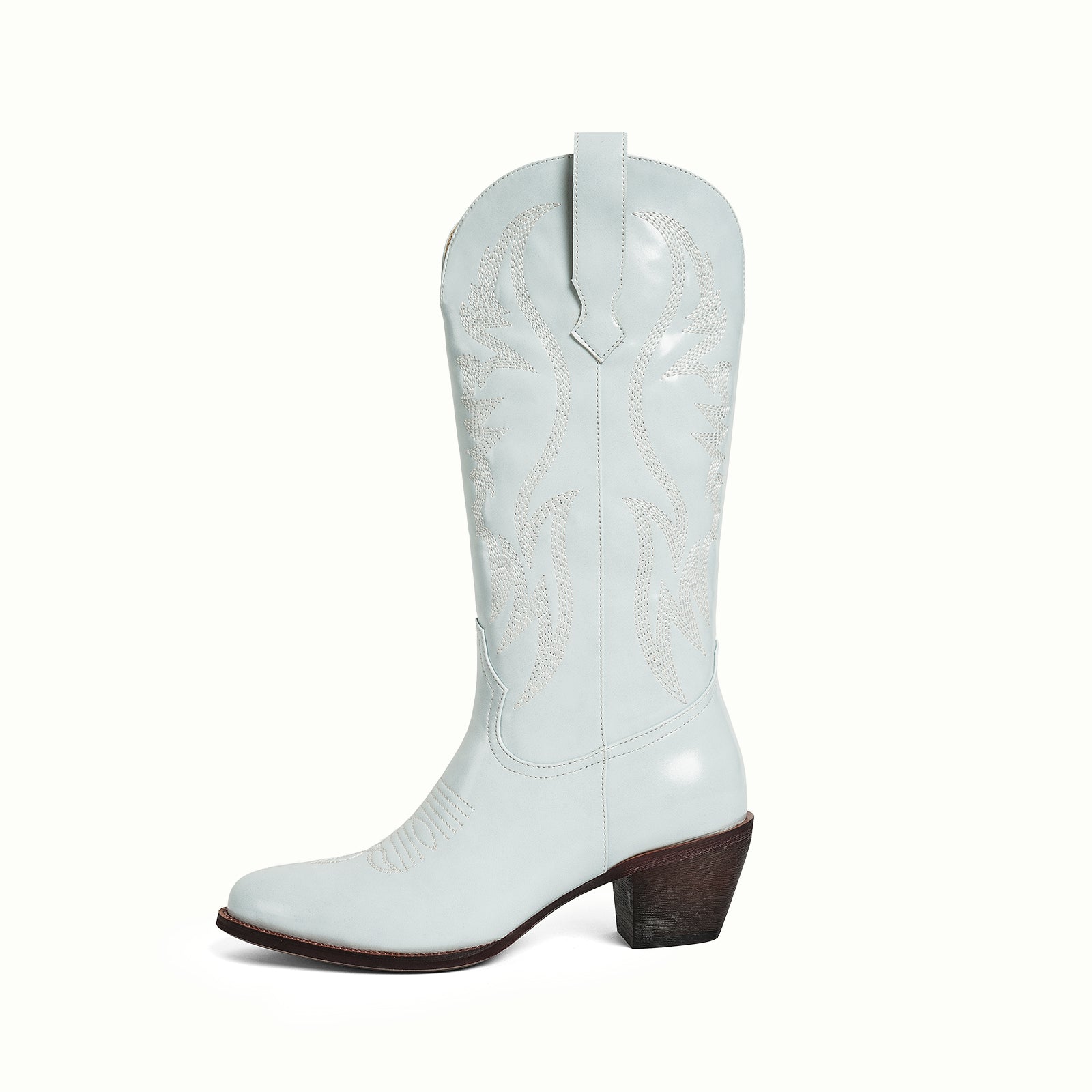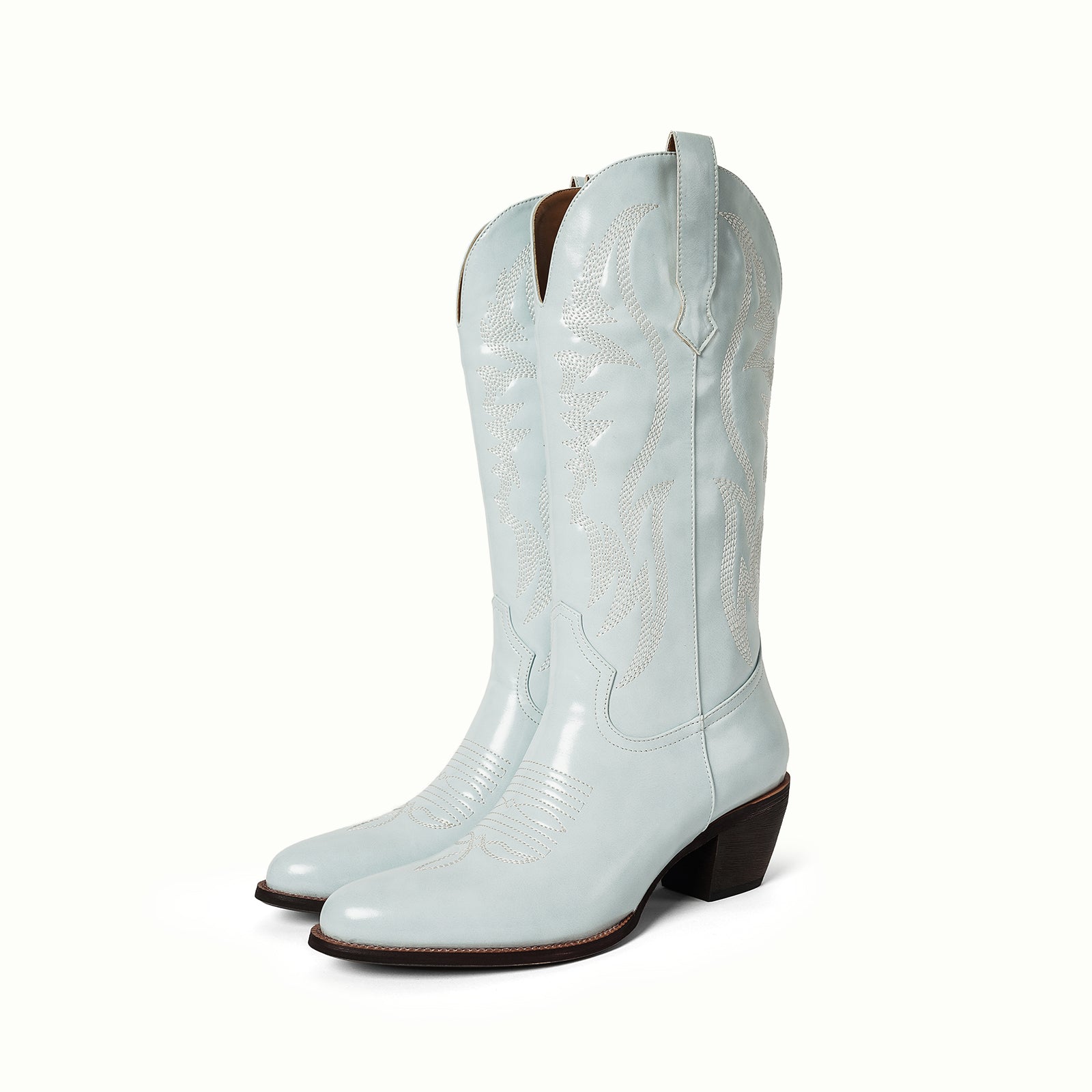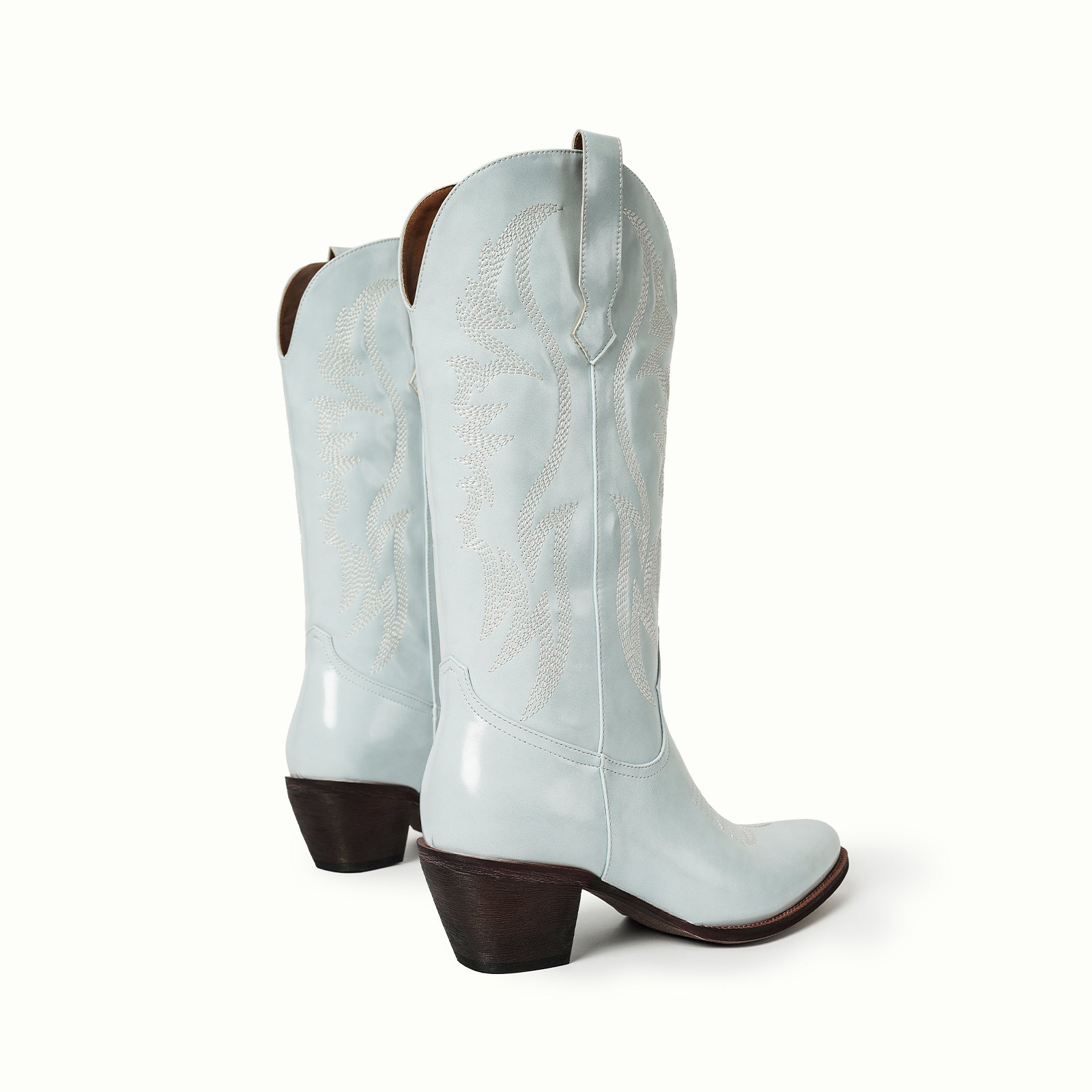 Mid-calf classic embroidery vegan leather Western boots in blue.