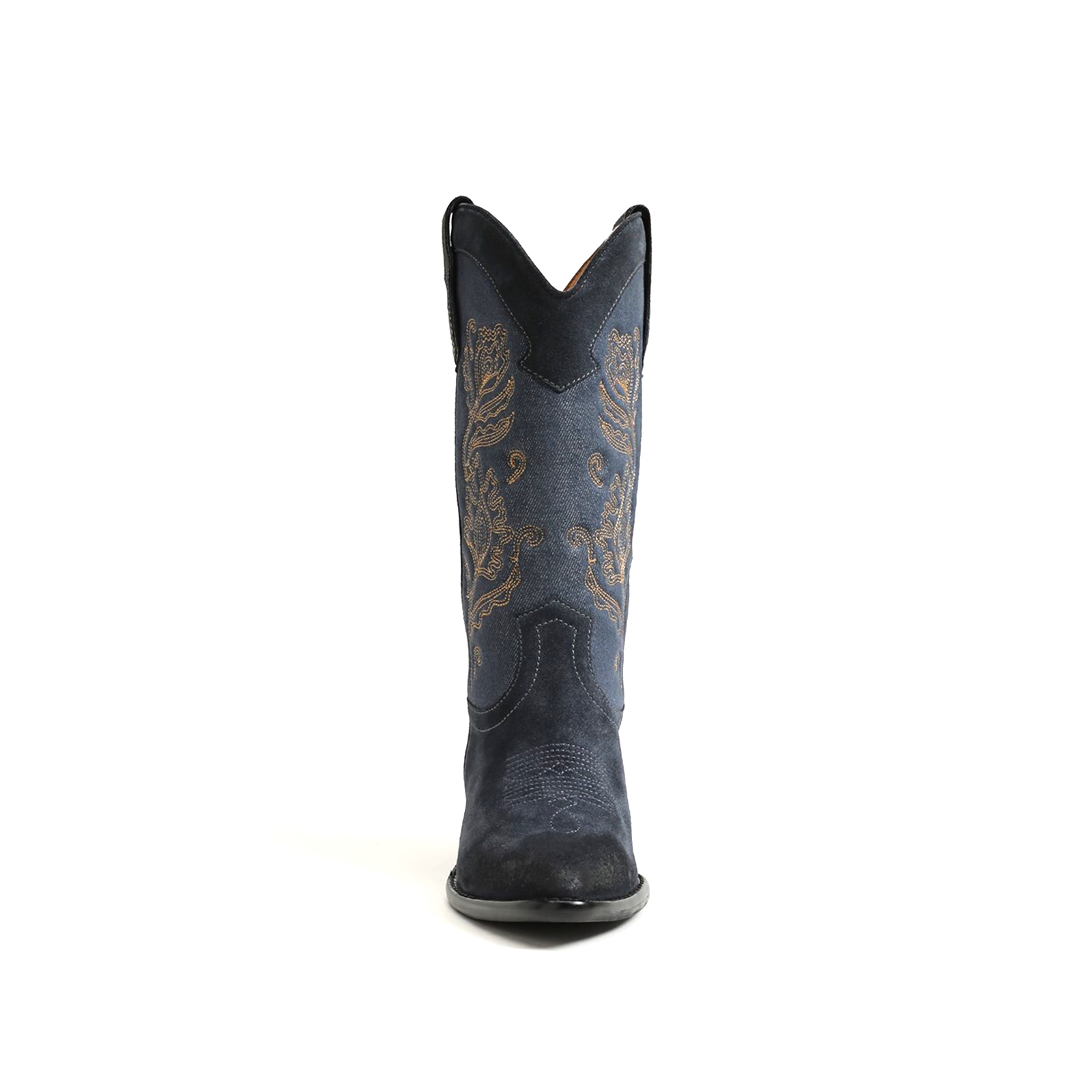 Blue Denim Almond-Toe Flowers Embroidery Mid Calf Cowgirl Boots.