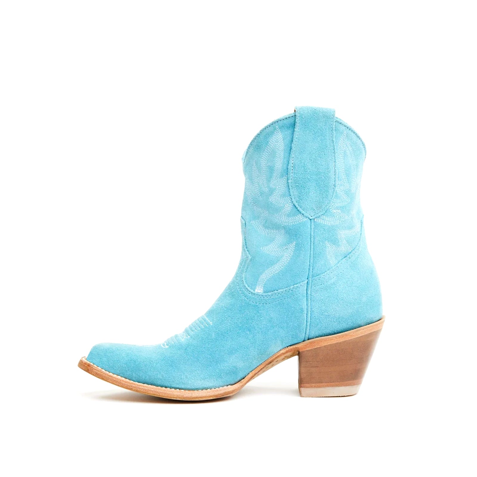 Blue Faux Suede Almond-Toe Embroidery Ankle Cowgirl Boots.