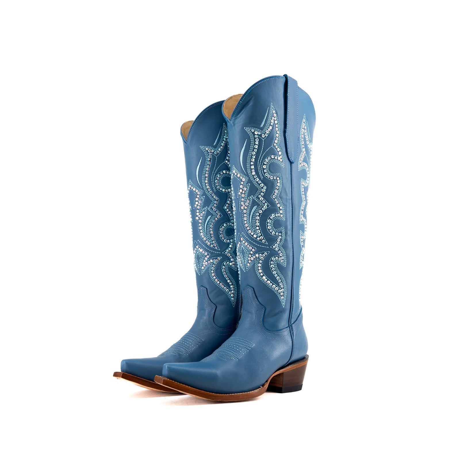 Blue Snip-Toe Rhinestone And Embroidery Half-Zip Knee High Cowgirl Boots.