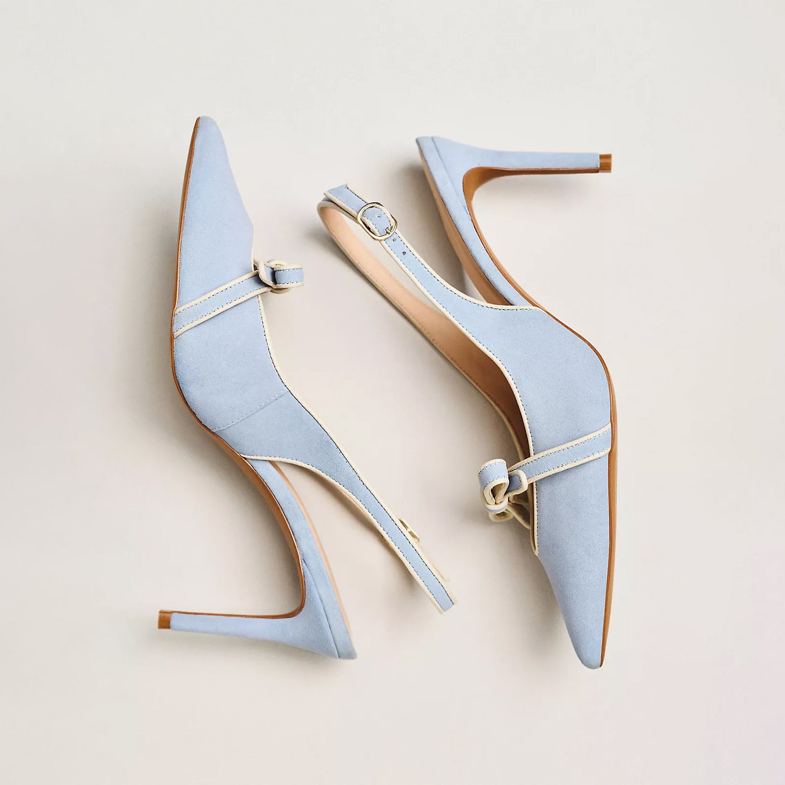 Delicate and graceful — Soft blue suede is paired with an elegant pointed-toe design, creating a look that is both charming and playful. The front bow adds a touch of femininity, while the slingback ankle strap ensures a secure fit that flatters the foot.