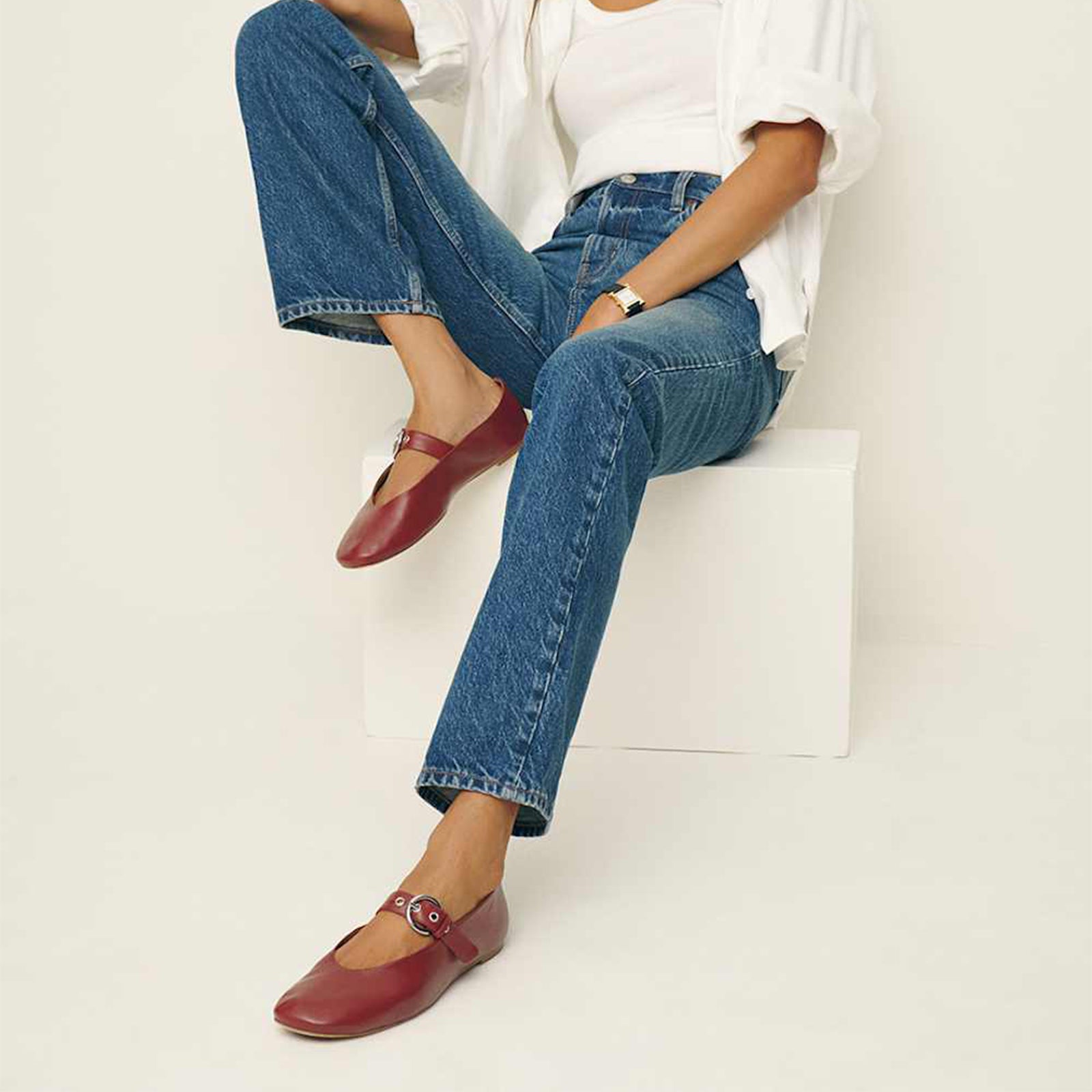 Brick Red Square-Toe Classic Buckle Bridge Strap Ballet Flats.