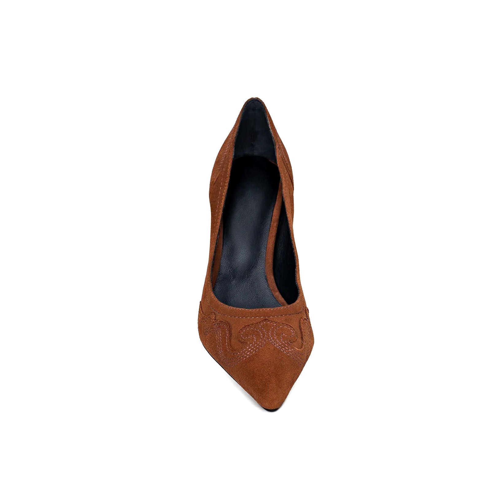 Brown Faux Suede Pointed-Toe Embroidery Classic Backless High Heels.