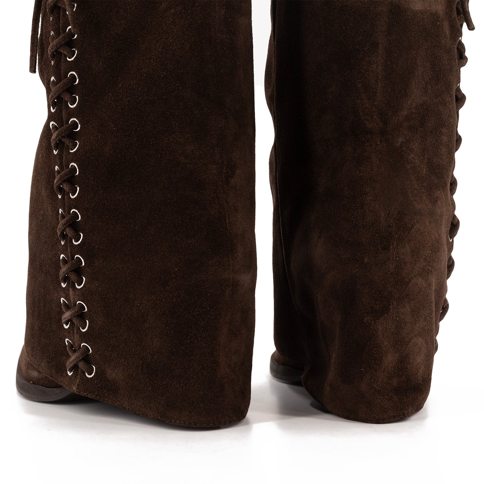 Brown Faux Suede Pointed-Toe Fold-Over Side Lace-Up Mid Calf Cowgirl Boots.