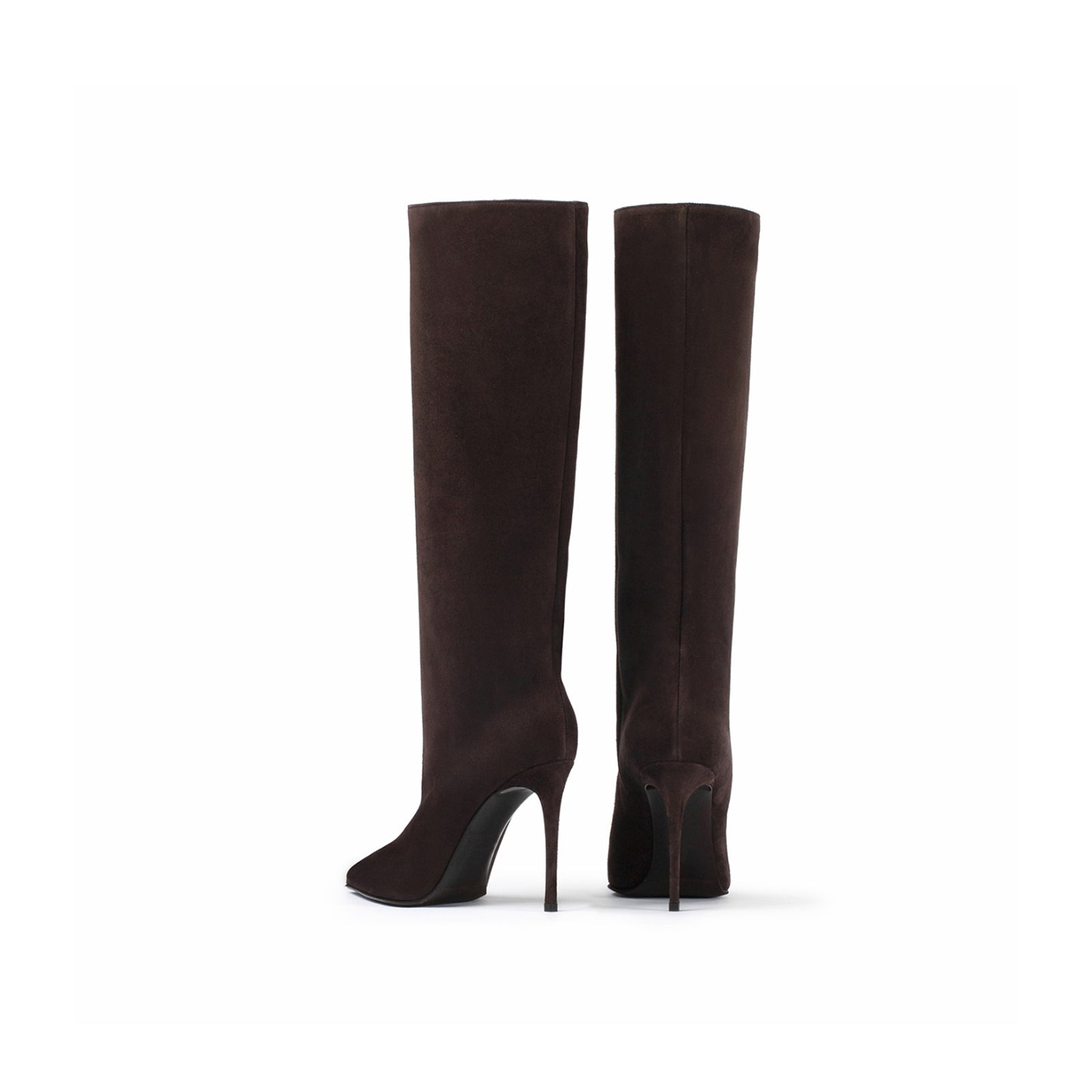 Brown Faux Suede Pointed-Toe Simple Wide Calf Knee High Tall Stiletto Boots.