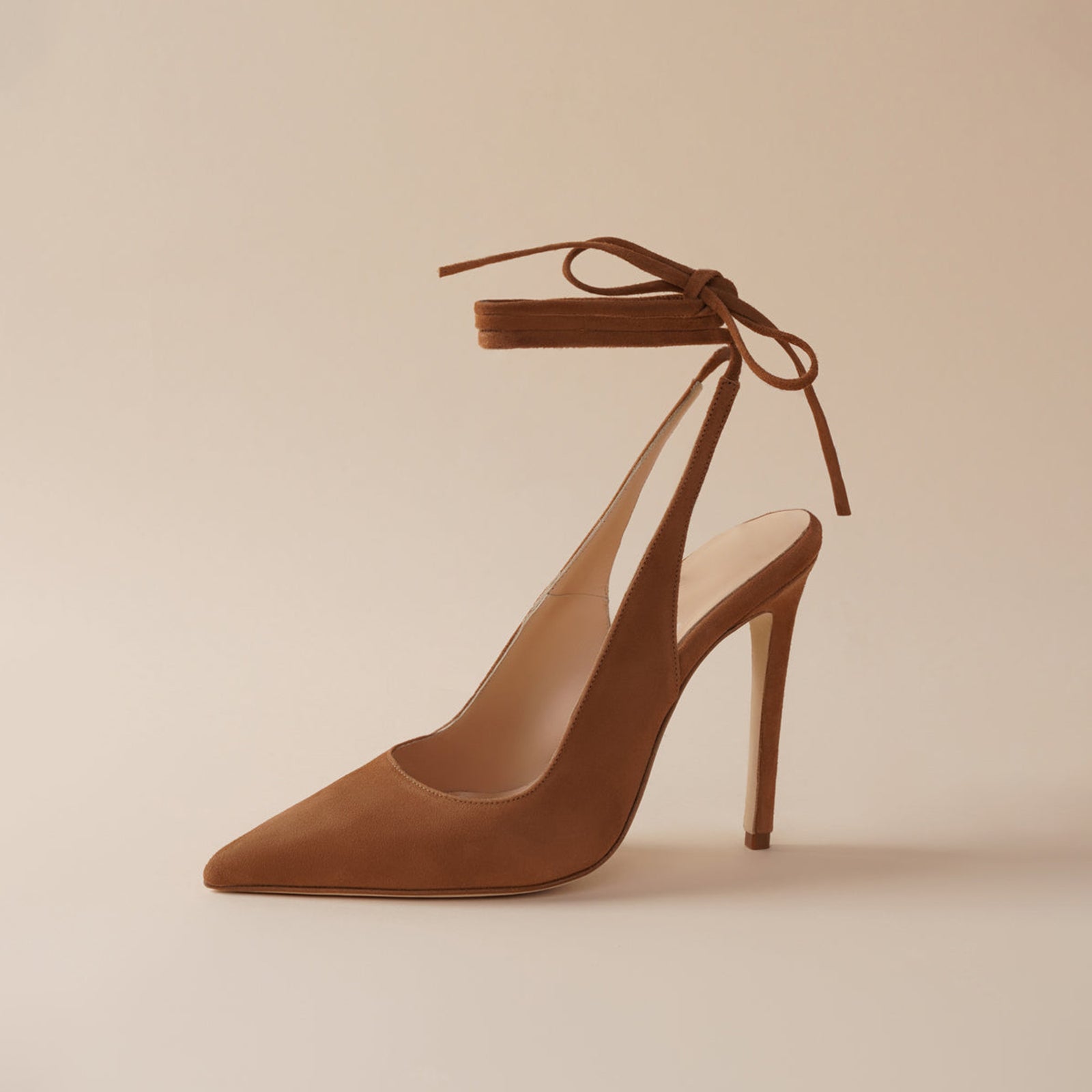 Brown Faux Suede Pointed-Toe Slingback Ankle Laces High Heels.
