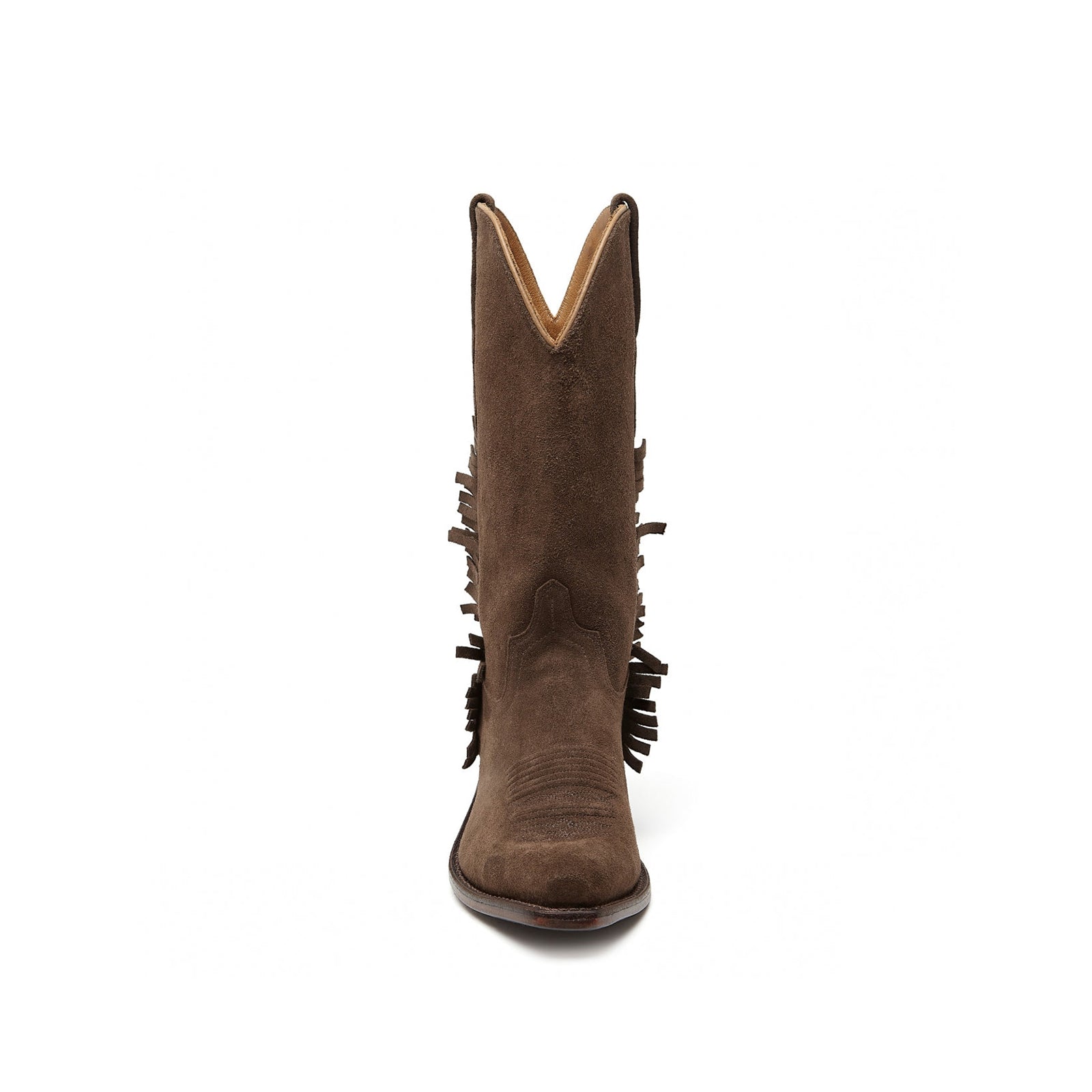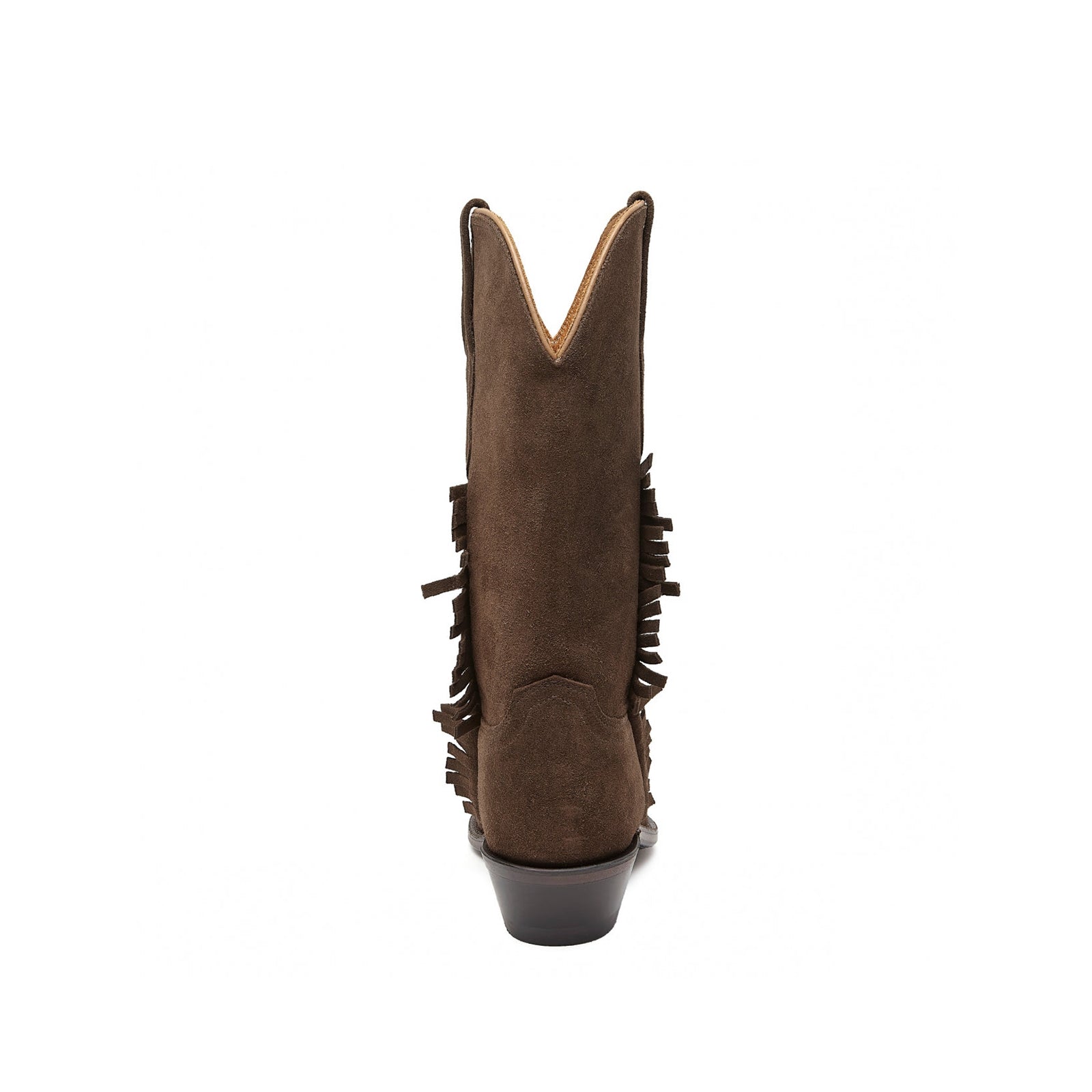 Brown Faux Suede Snip-Toe Short Fringe Mid Calf Cowgirl Boots.