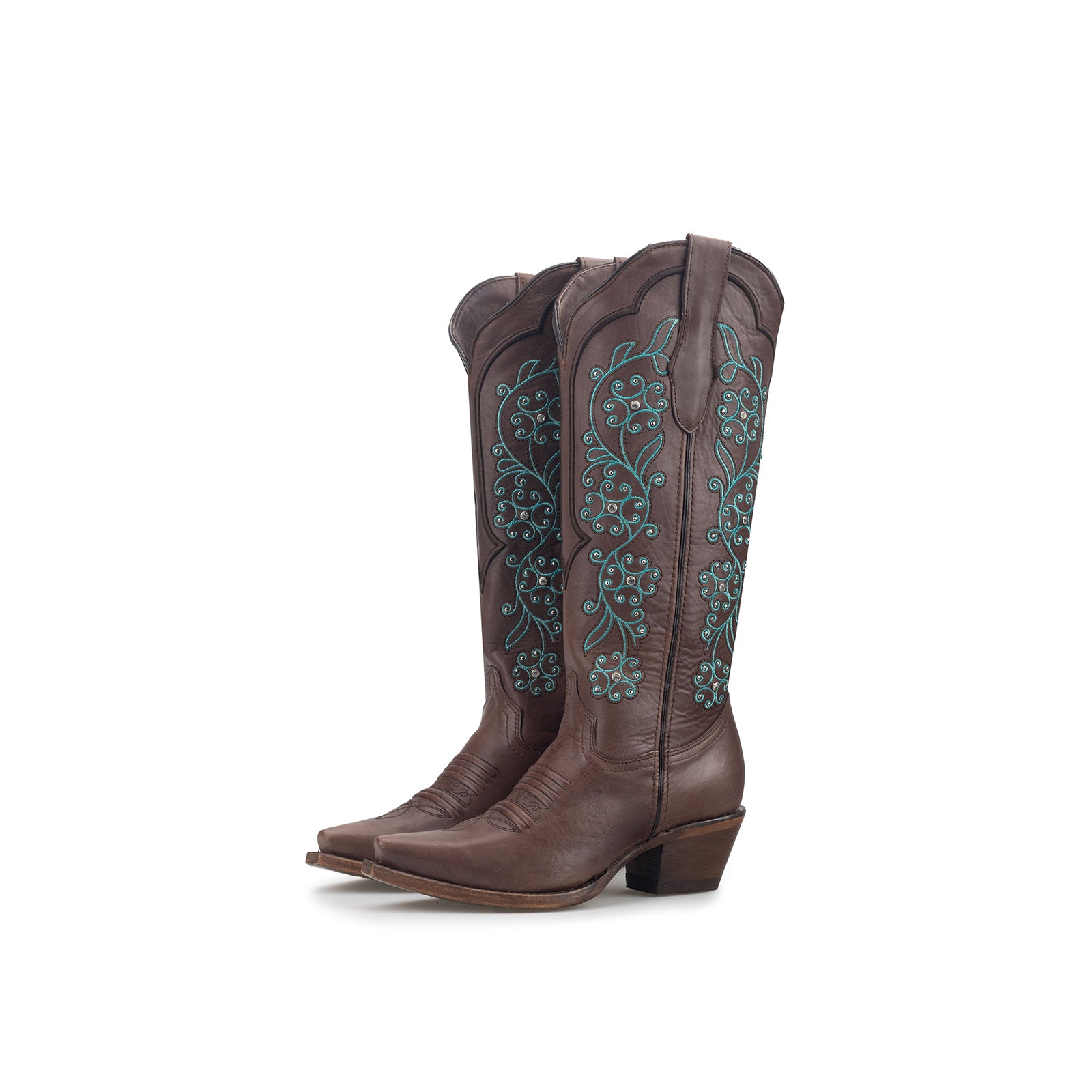 Brown Snip-Toe Embroidery Rhinestone Studs Half-Zip Knee High Cowgirl Boots.