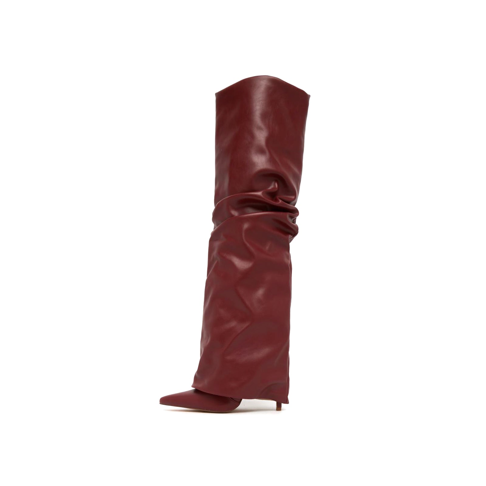 Burgundy Pointed-Toe Ruched Over-The-Knee Stiletto Boots.