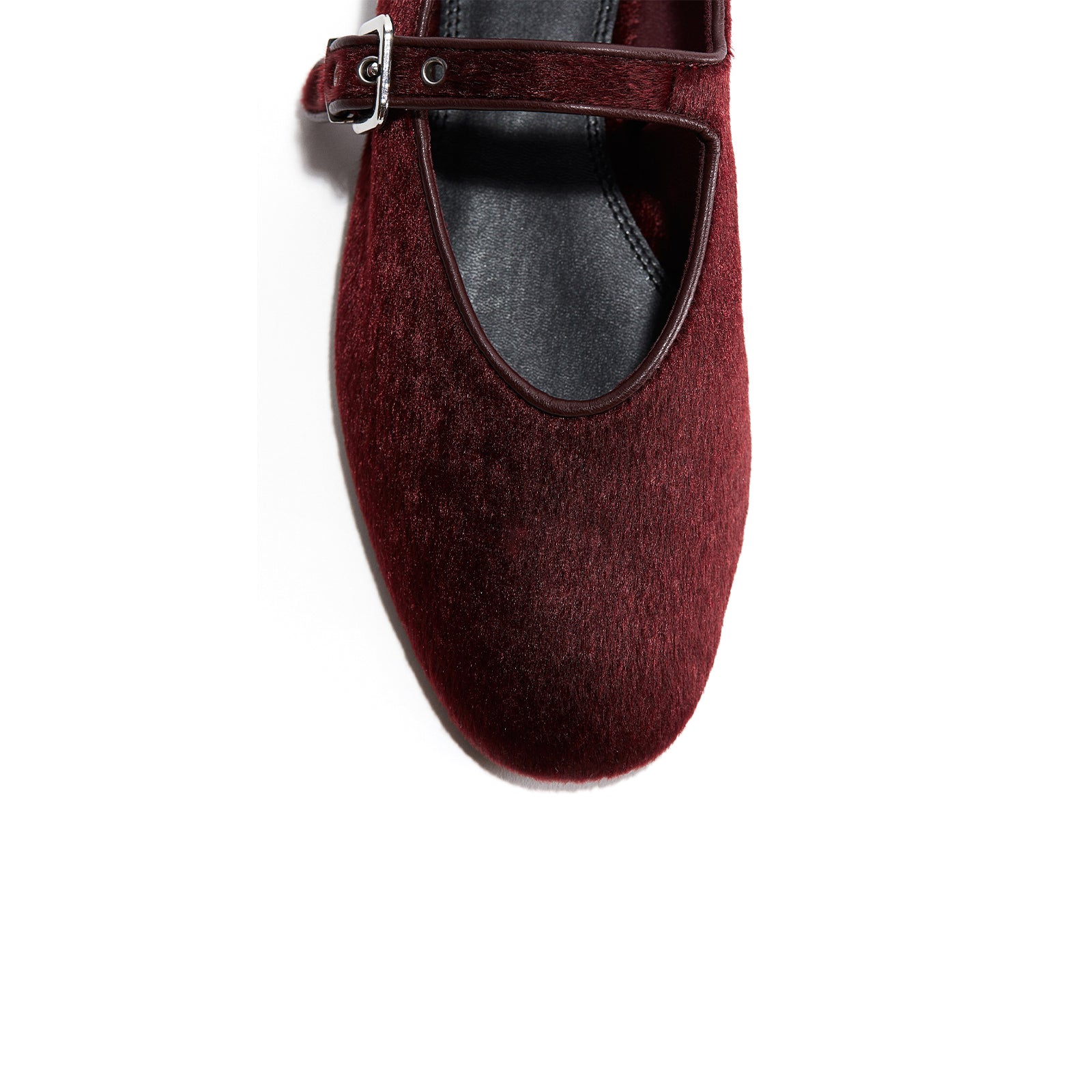 Burgundy Pony Hair Square-Toe Bridge Strap Ballet Flats.
