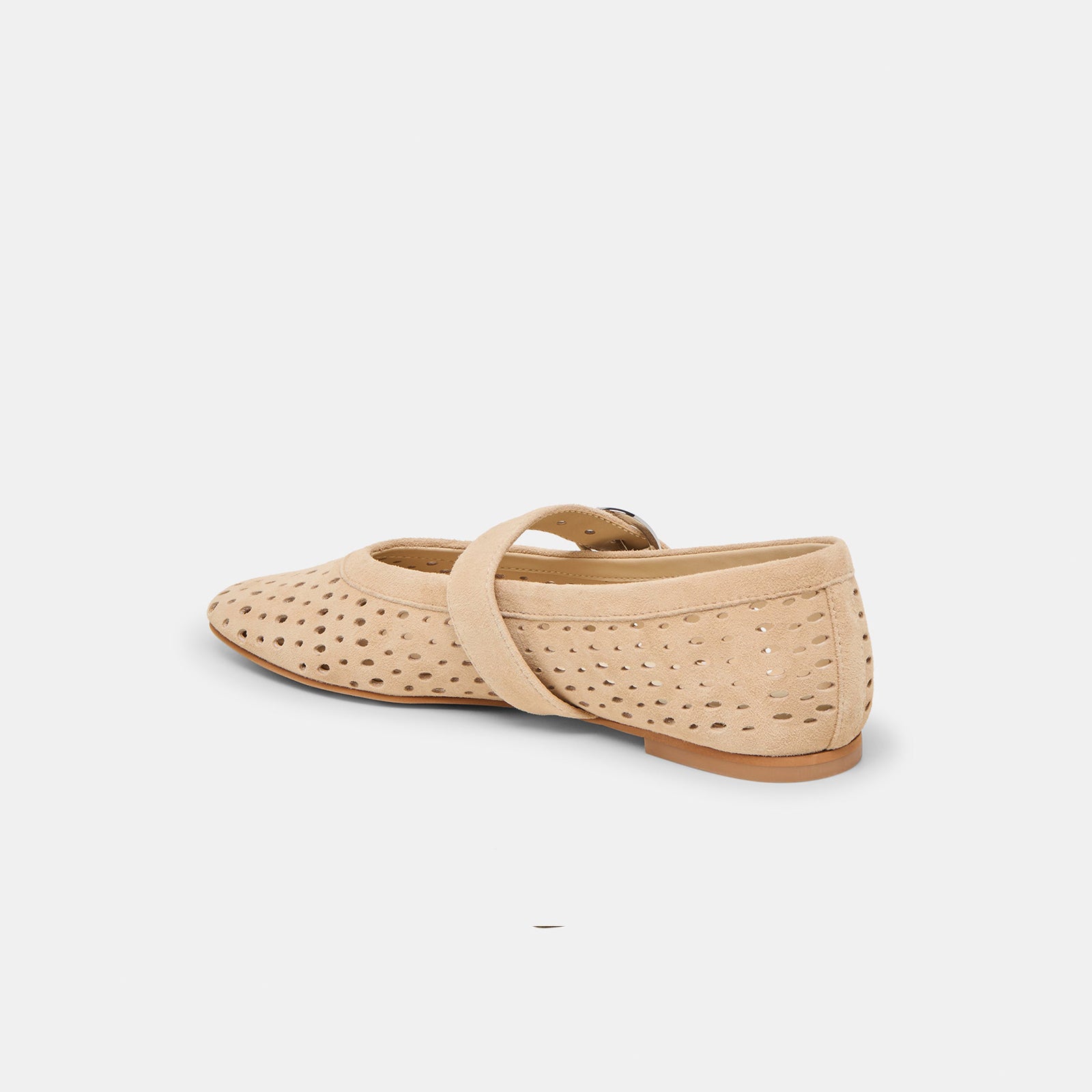 Camel Perforated Faux Suede Square-Toe Mary Janes Ballet Flats.