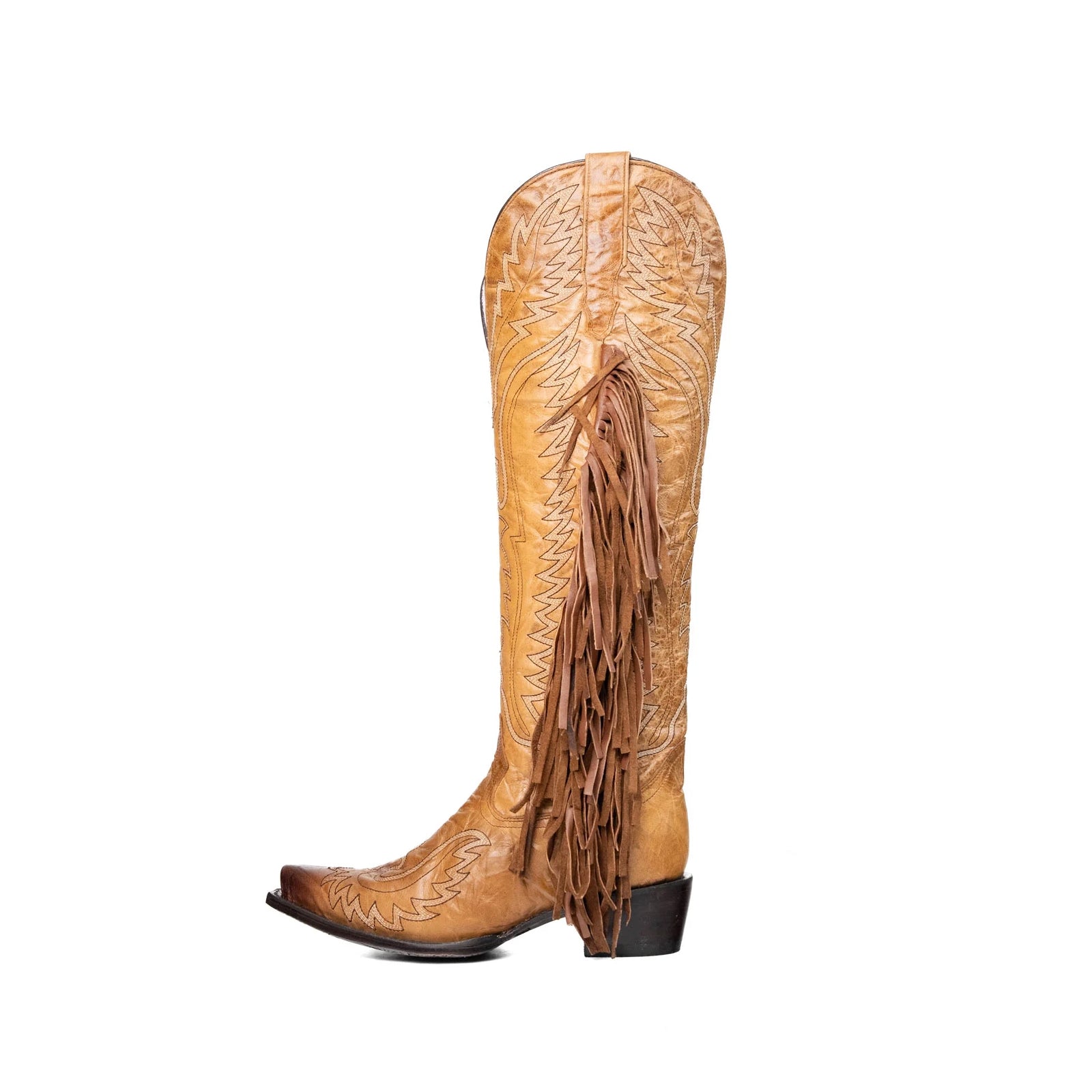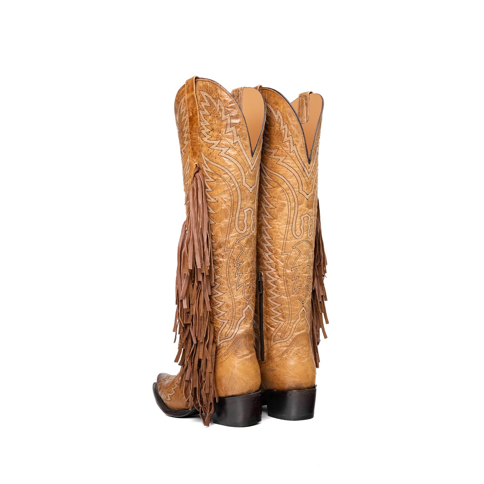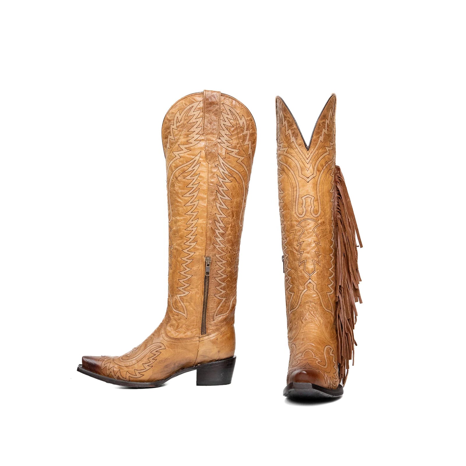 Camel Snip-Toe Western Embroidery Side Fringe Half-Zip Knee High Cowgirl Boots.