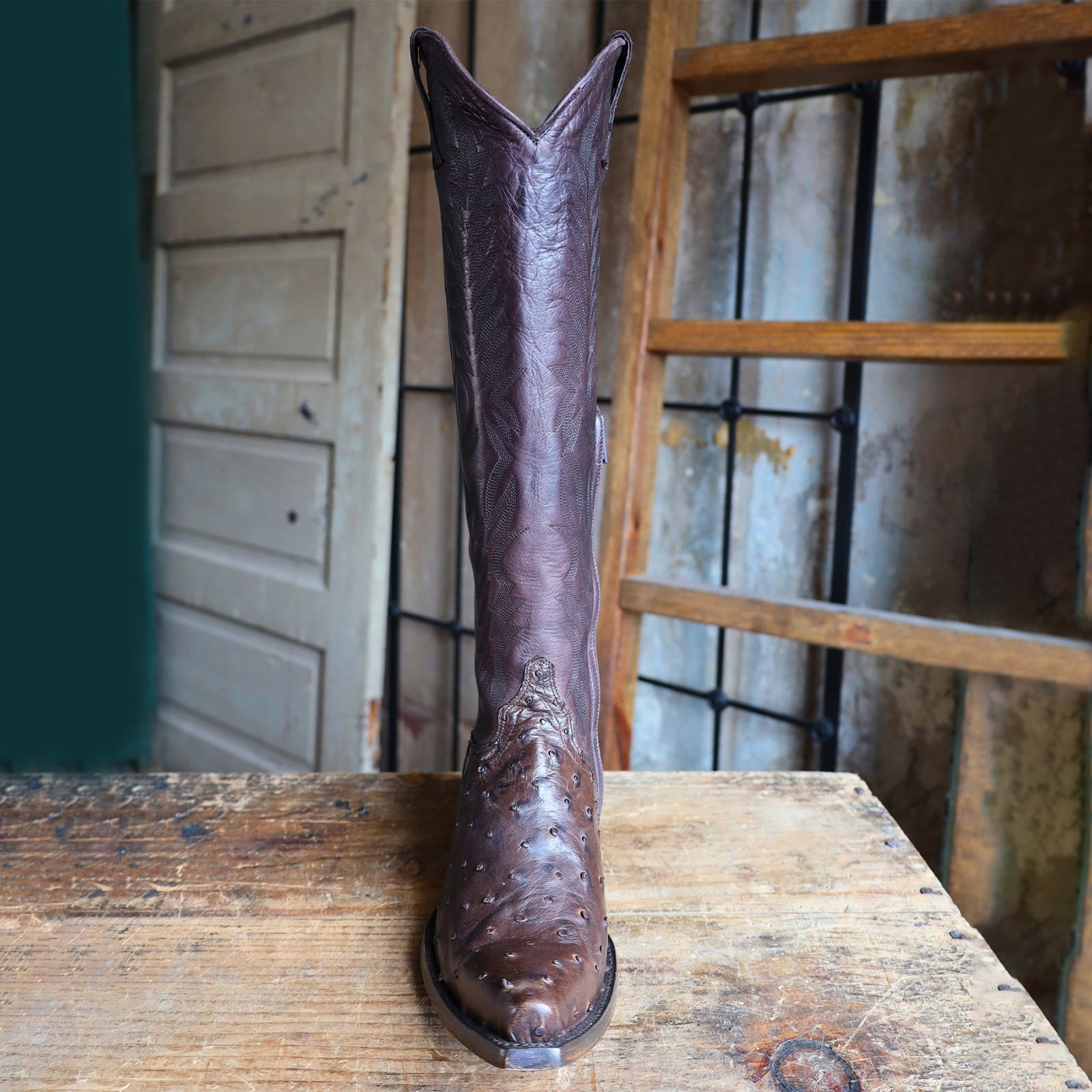 Chocolate Contrast Vegan Leather And Ostrich Print Snip-Toe Embroidery Half-Zip Knee High Cowgirl Boots.