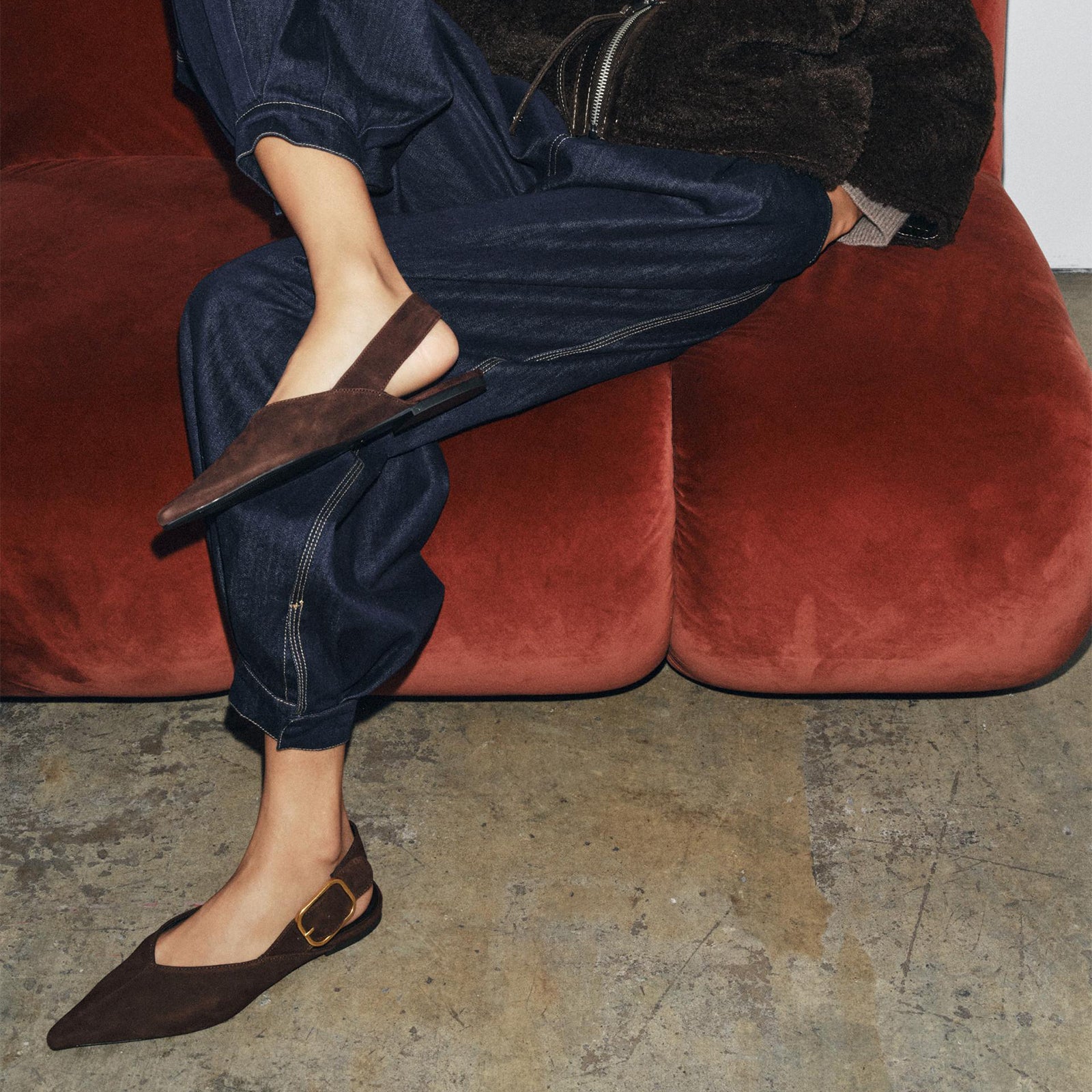 Chocolate Faux Suede Pointed-Toe Slingback Buckle Flats.