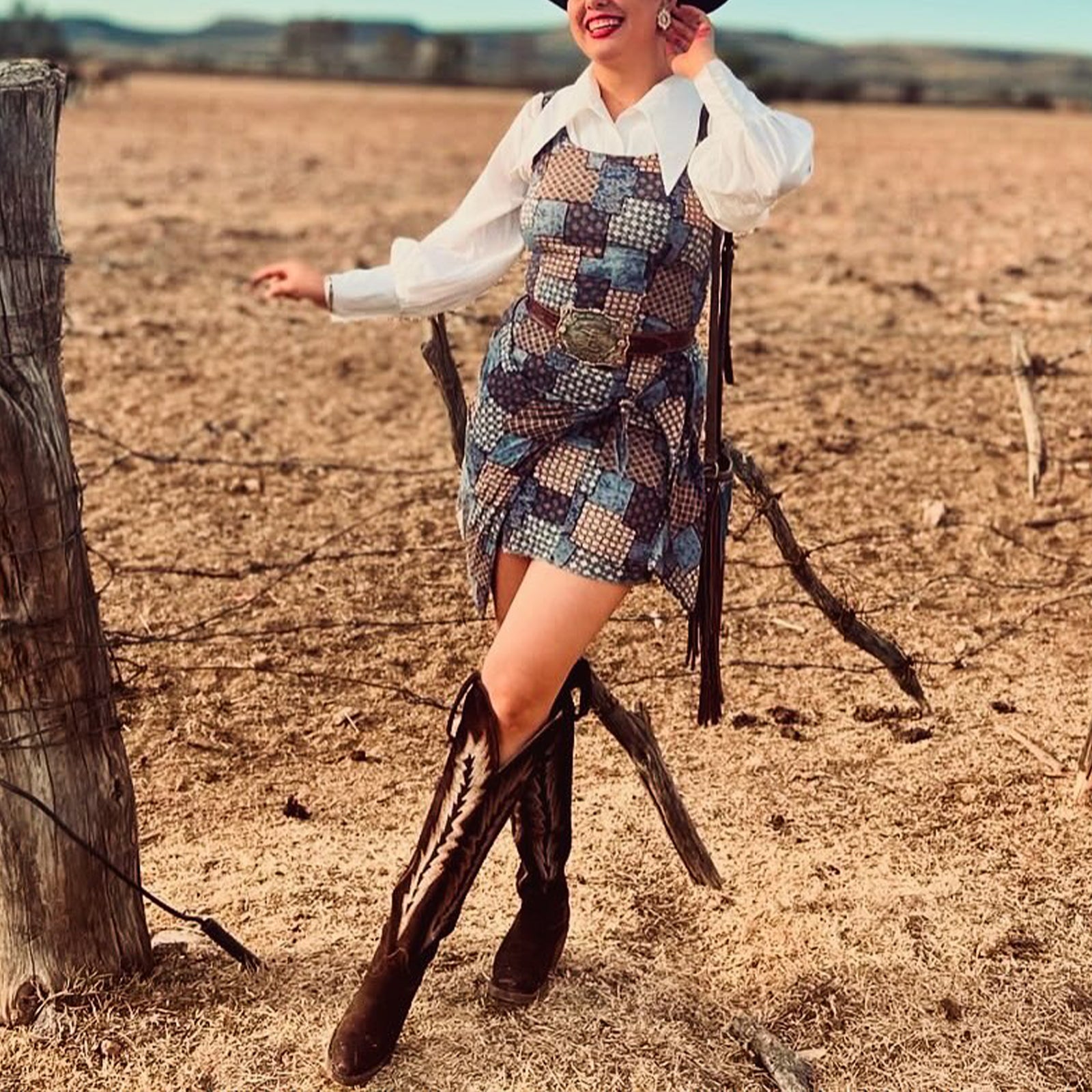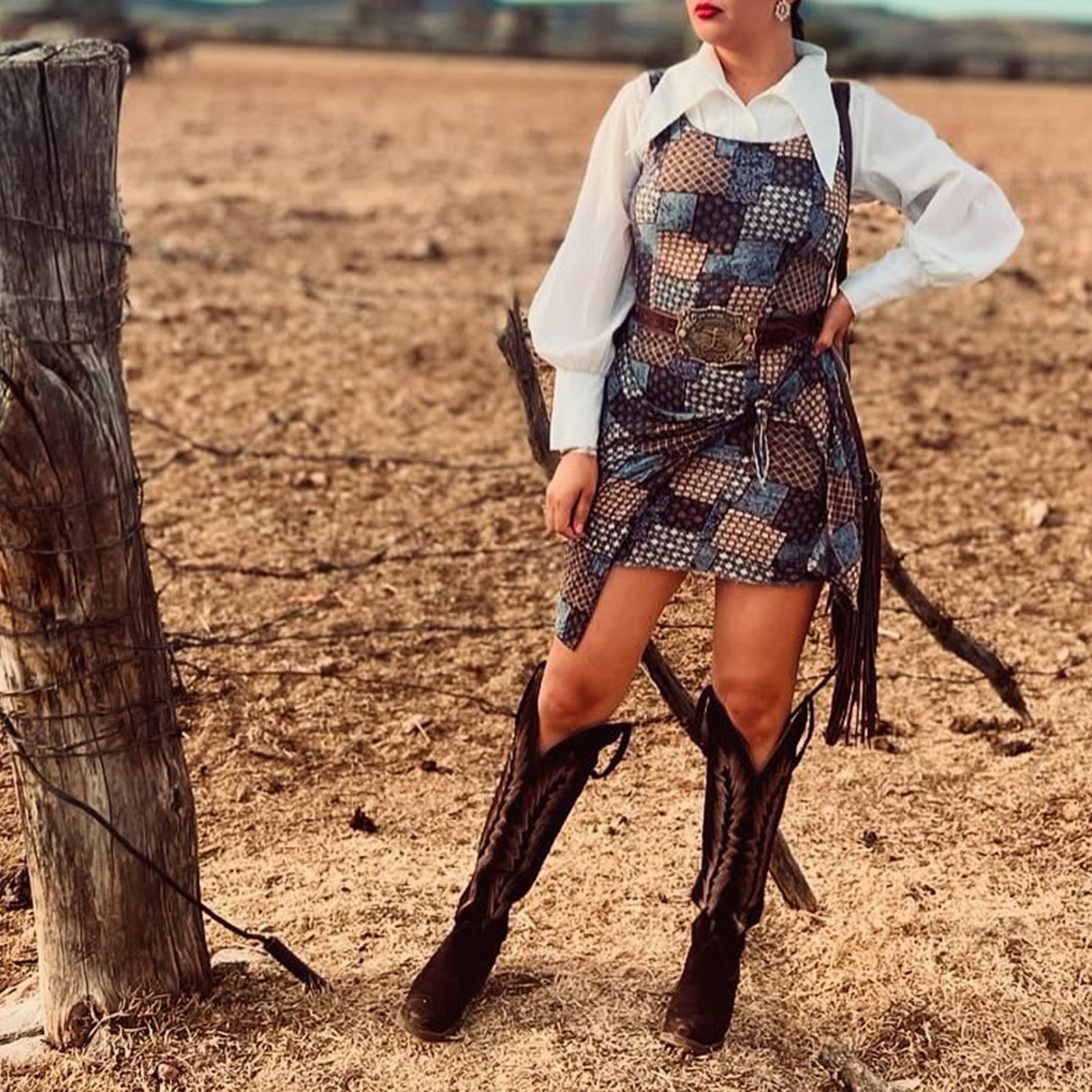 Dramatic and refined, these over-the-knee cowgirl boots blend rich tones with classic embroidery, bringing bold Western spirit to a striking tall design.