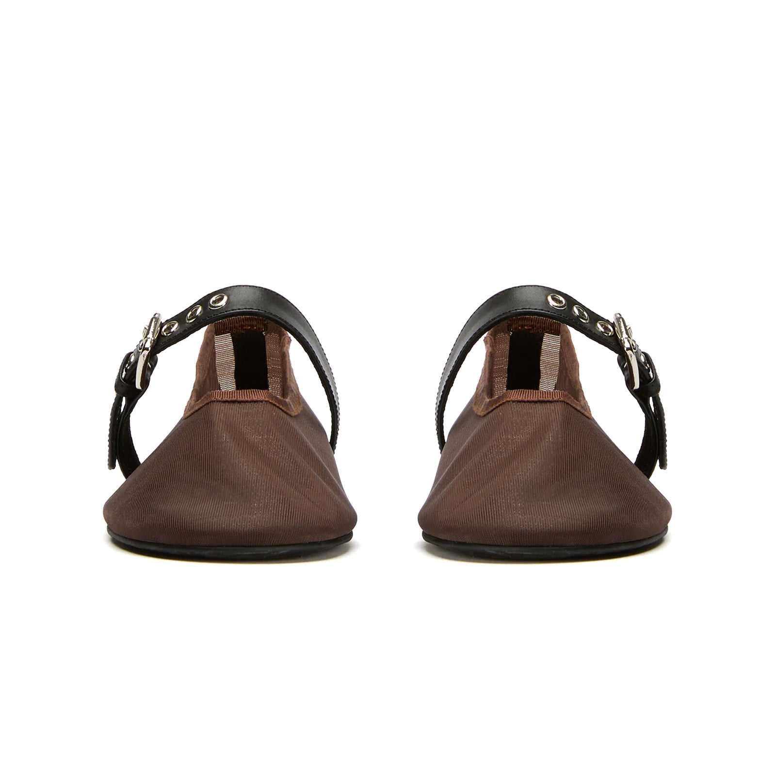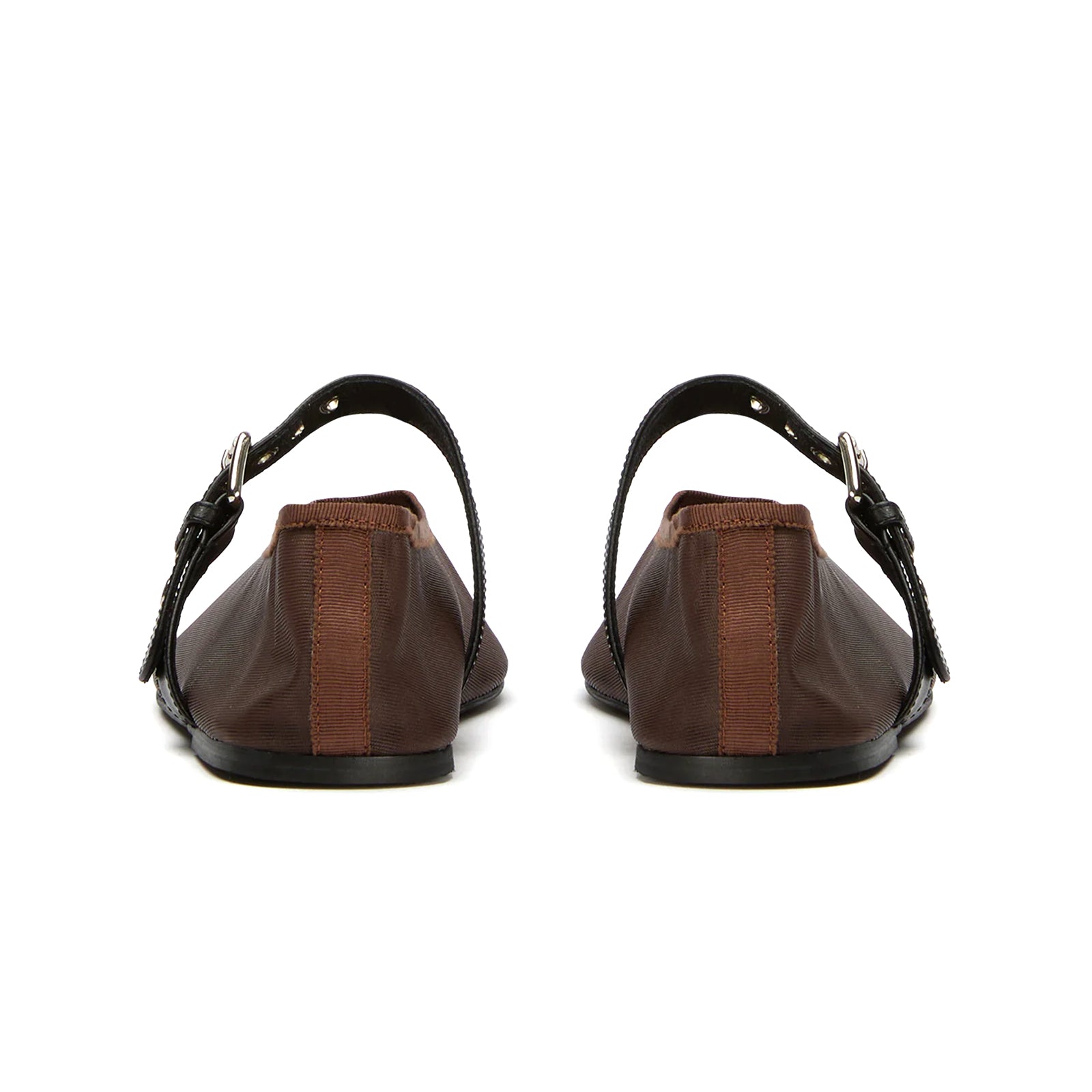 Chocolate Mesh Round-Toe Ballet Flats With Bridge Strap.