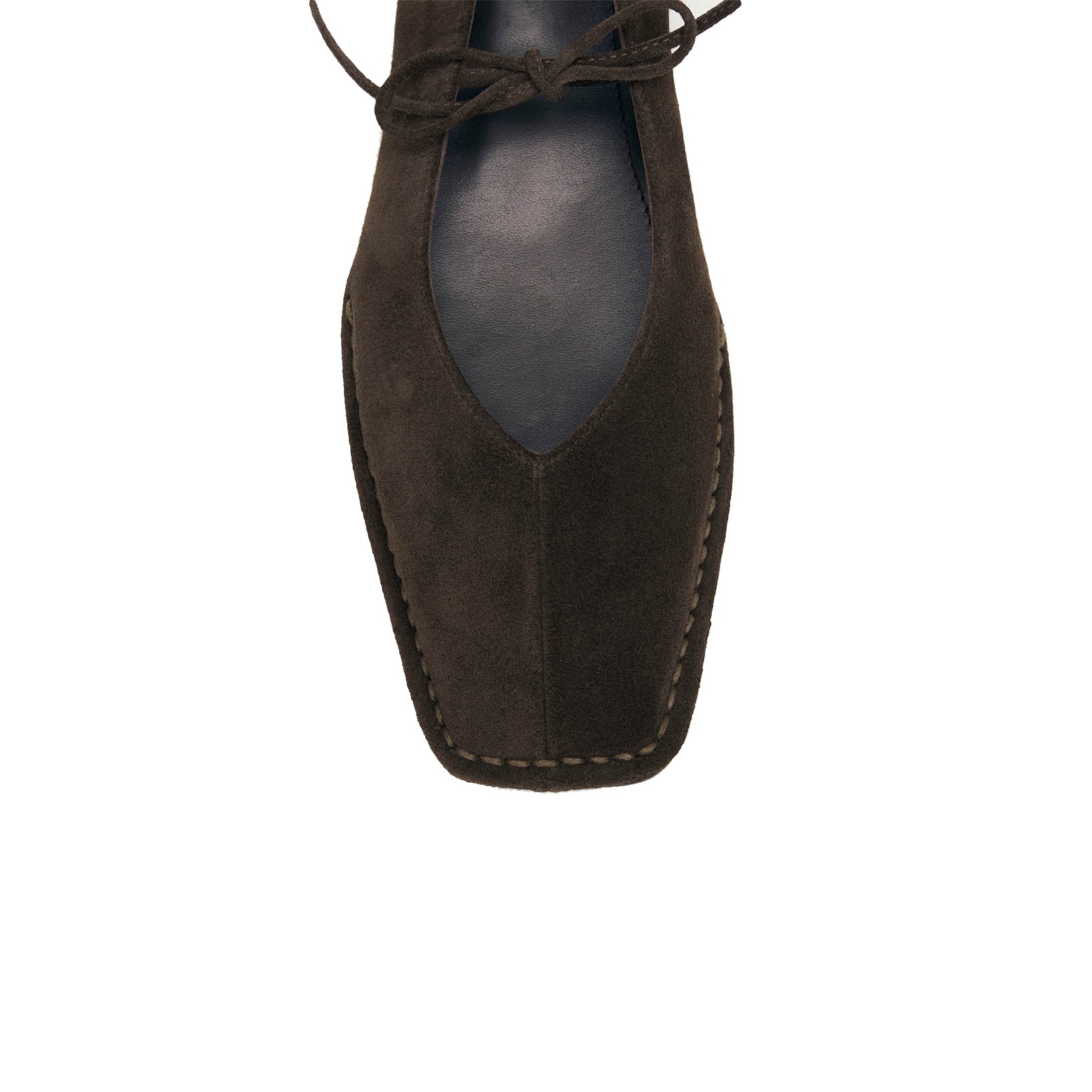Coffee Faux Suede Square-Toe V-Cut Vamps Bridge Self-Tie Bow Ballet Flats.