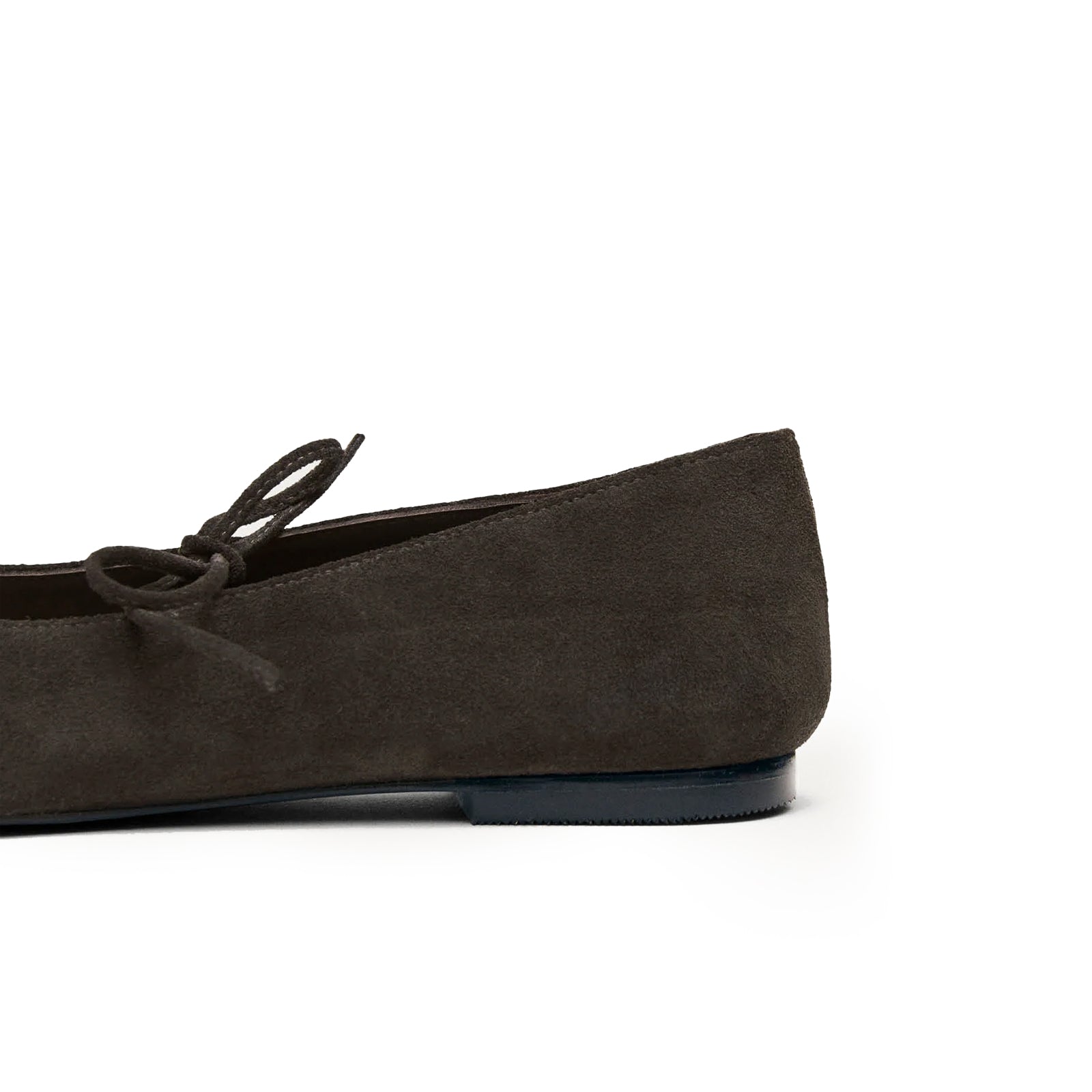 Coffee Faux Suede Square-Toe V-Cut Vamps Bridge Self-Tie Bow Ballet Flats