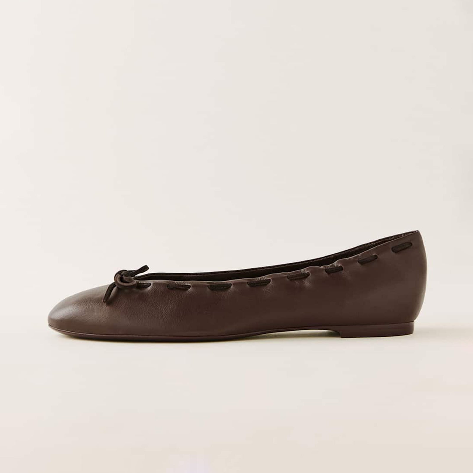 Coffee Round-Toe Running Stitch Front Bow Slip-On Ballet Flats.