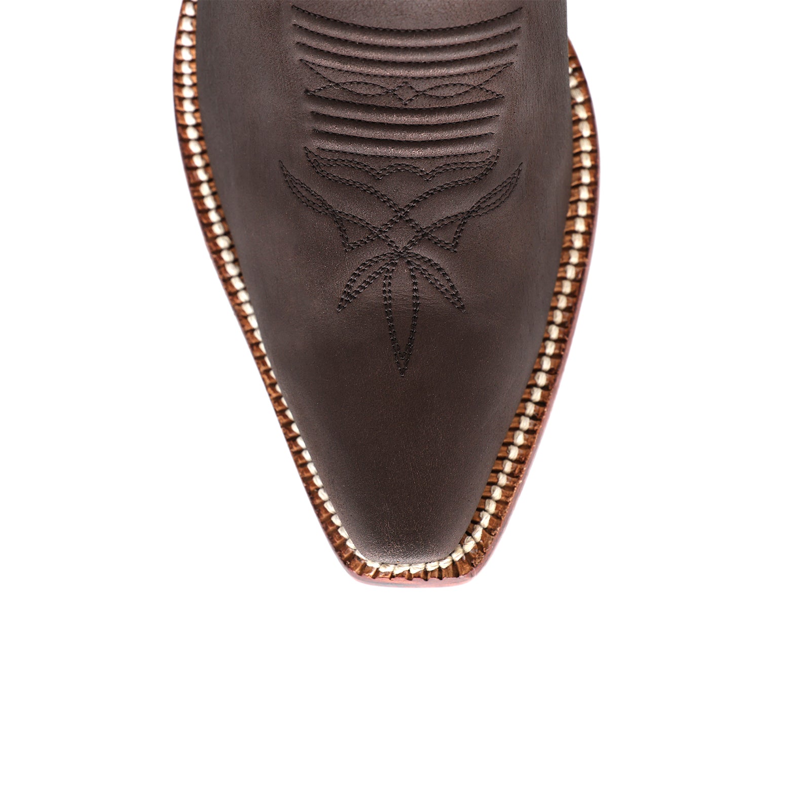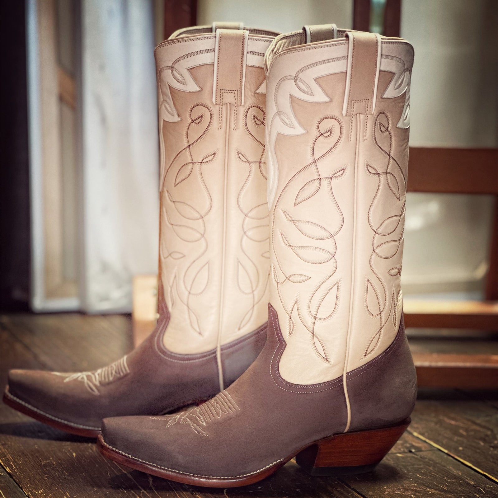 Contrast Beige And Chocolate Snip-Toe Embroidery Mid Calf Cowgirl Boots.