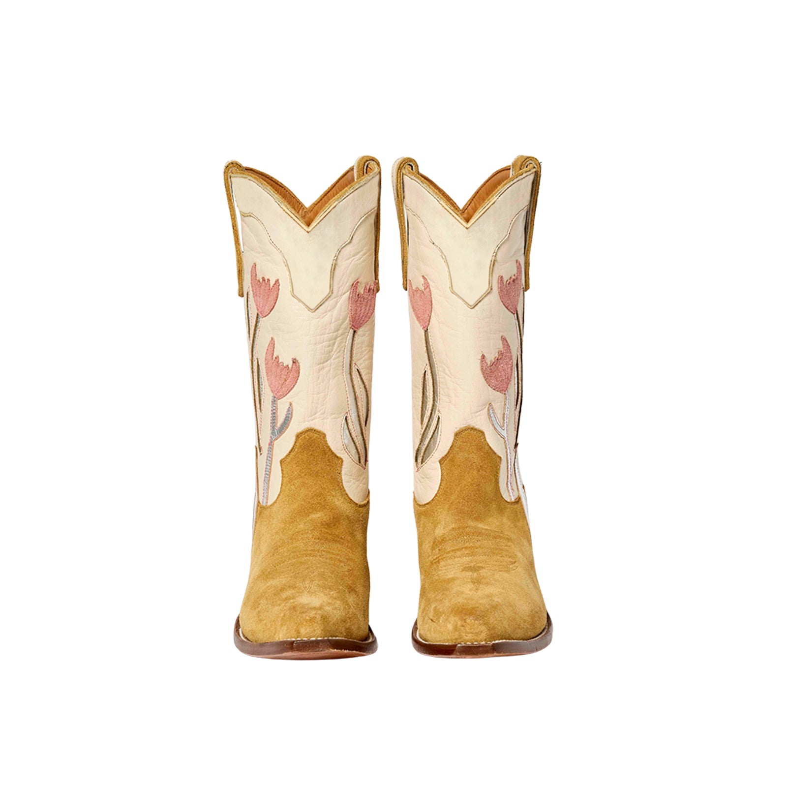 Contrast Bone And Camel Snip-Toe Tulip Inlay And Applique Mid Calf Cowgirl Boots.