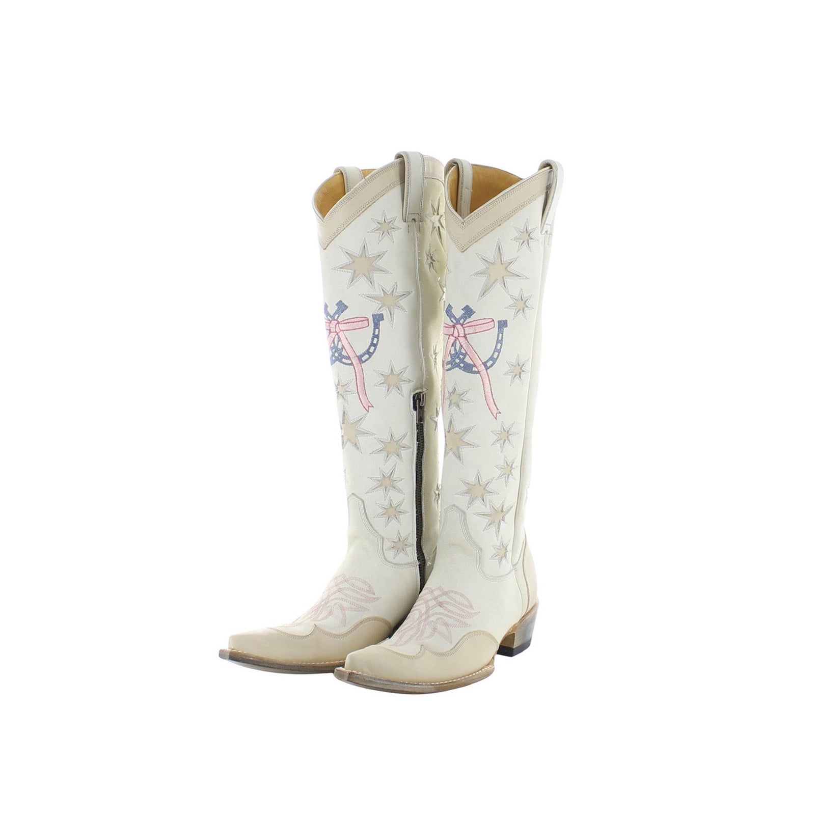 Contrast Cream And Bone Snip-Toe Stars Inlay Horseshoe And Bow Embroidery Half-Zip Knee High Cowgirl Boots.