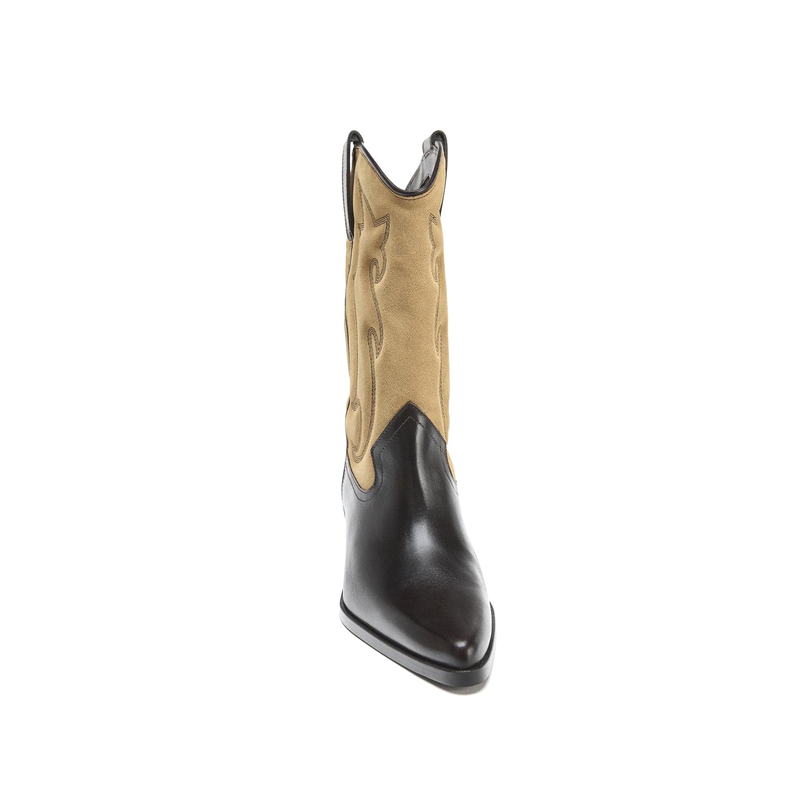Boldly Western, this contrast pair fuses tan and black tones with intricate embroidery, creating a striking mid-calf boot that captures timeless cowgirl spirit with sharp, modern edge.