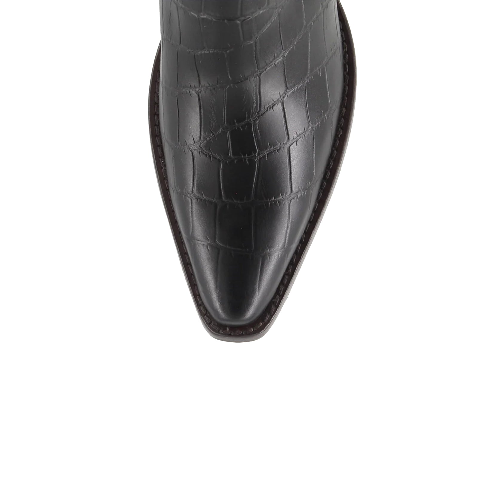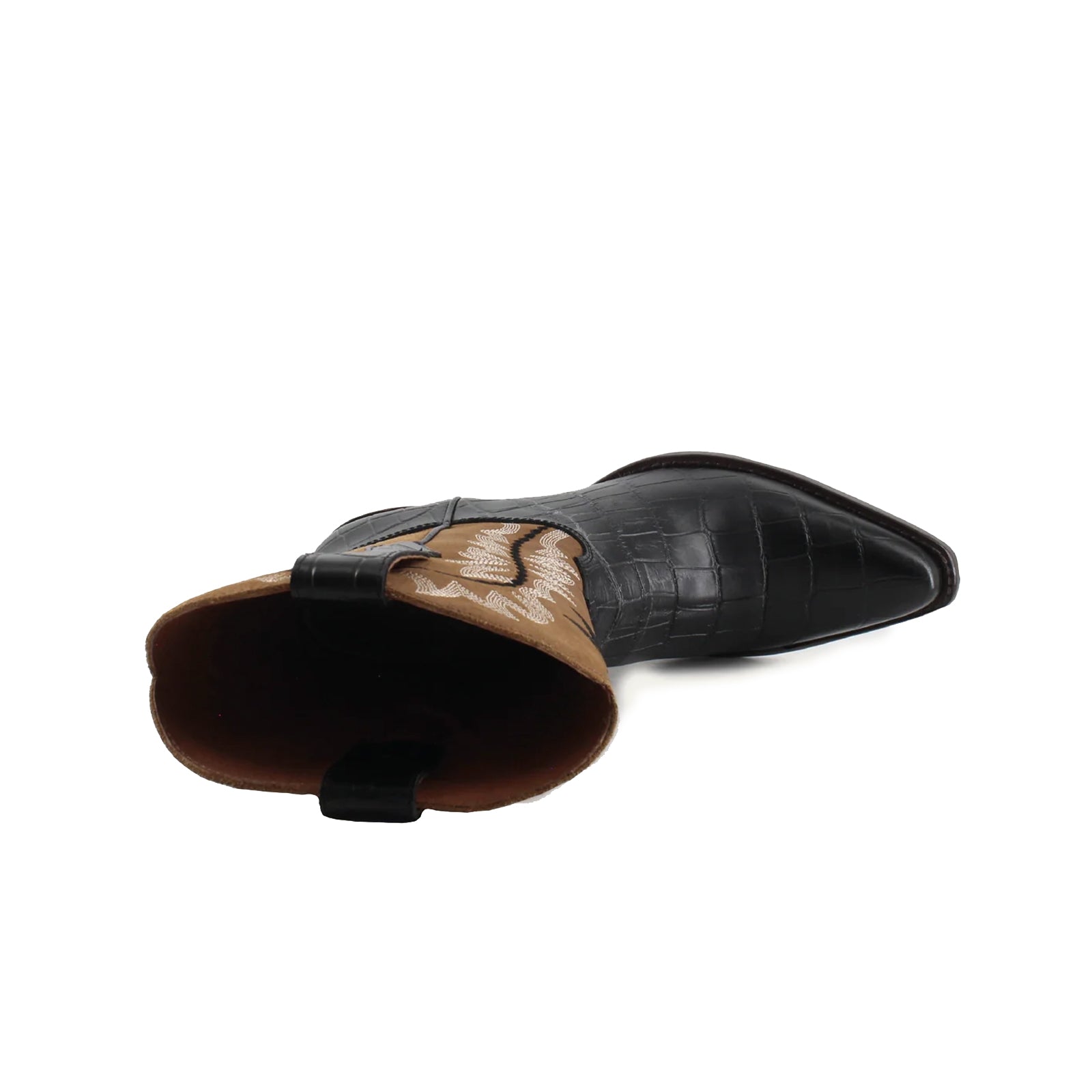 Blending texture and tone, these boots fuse soft tan suede with bold black crocodile patterning, creating a striking Western look with refined edge.