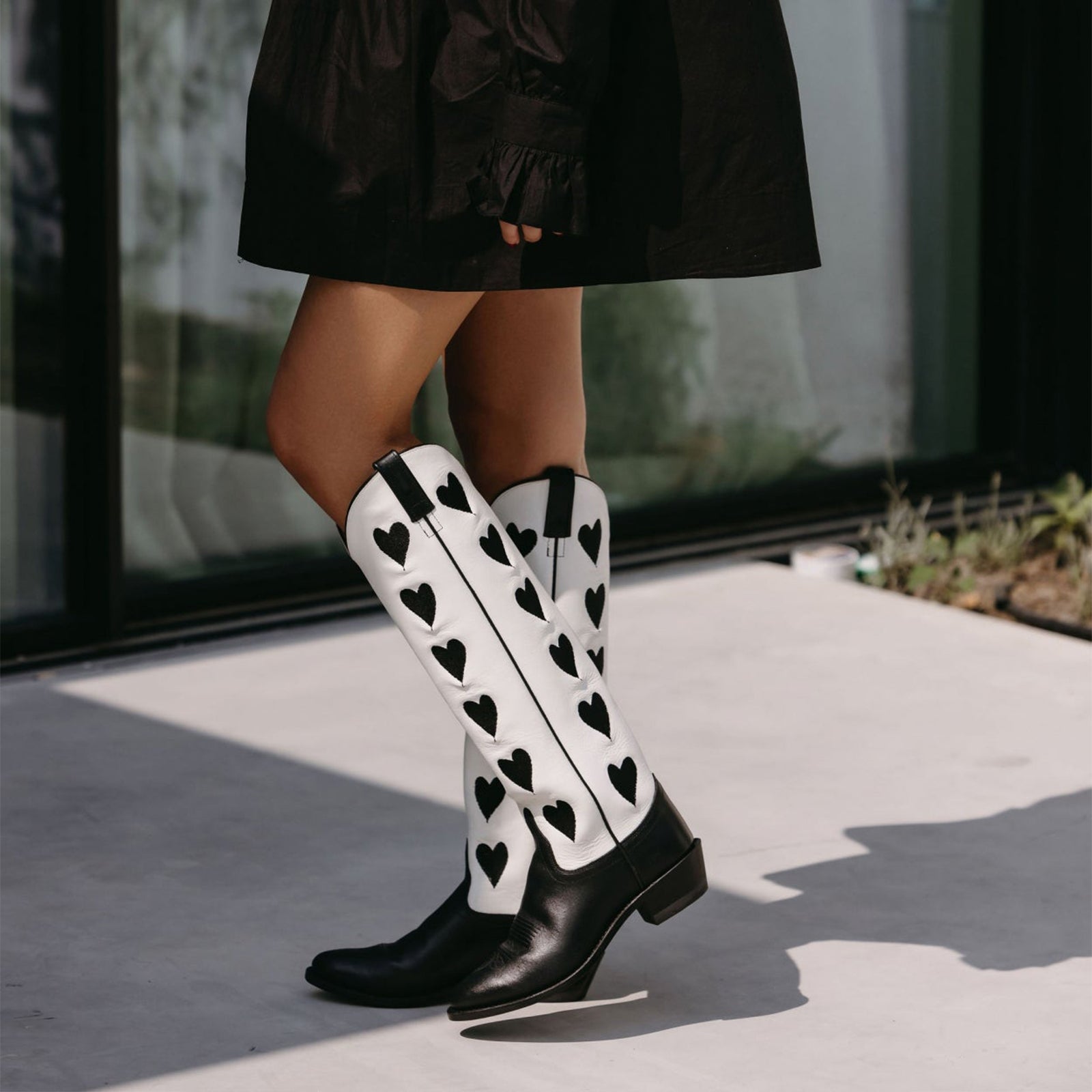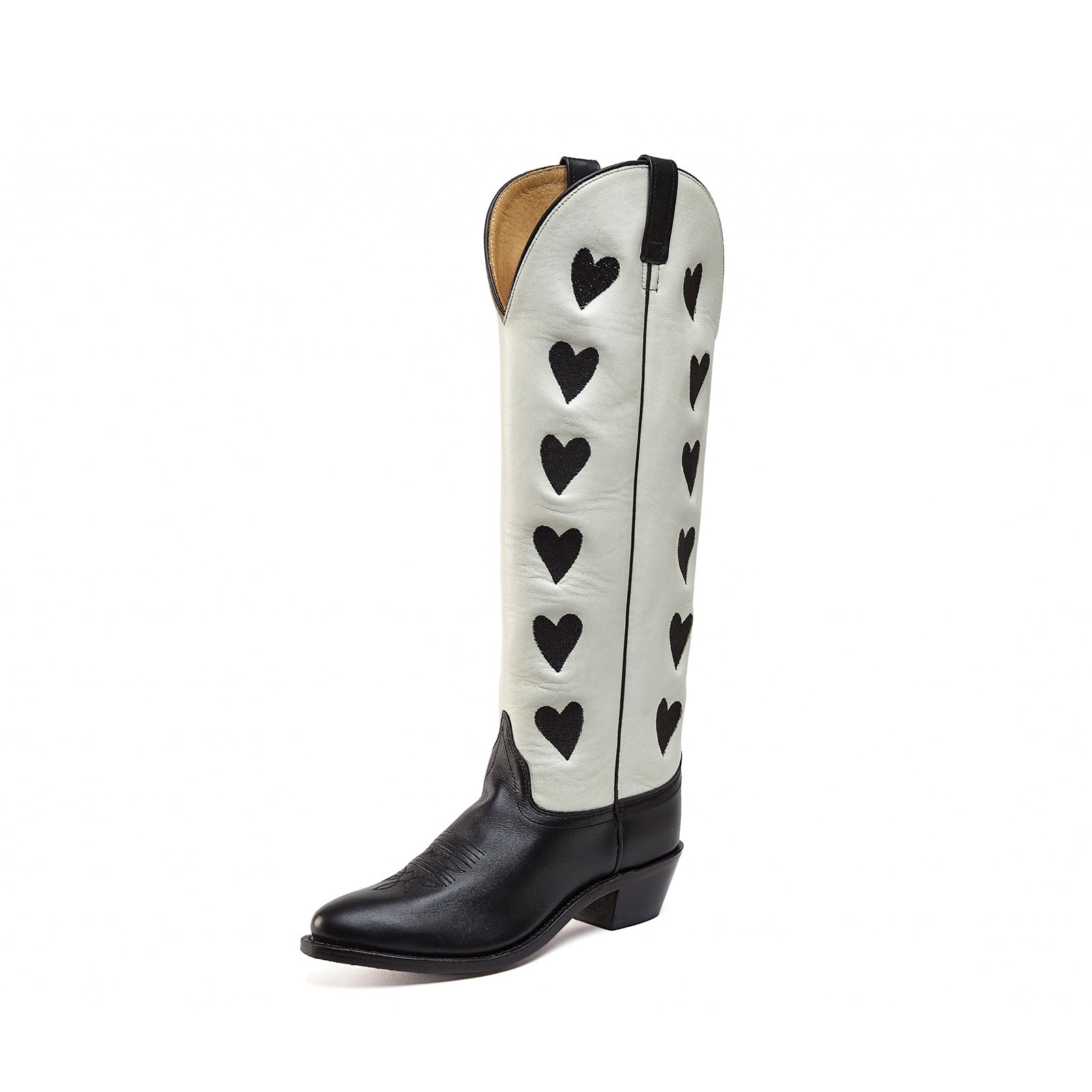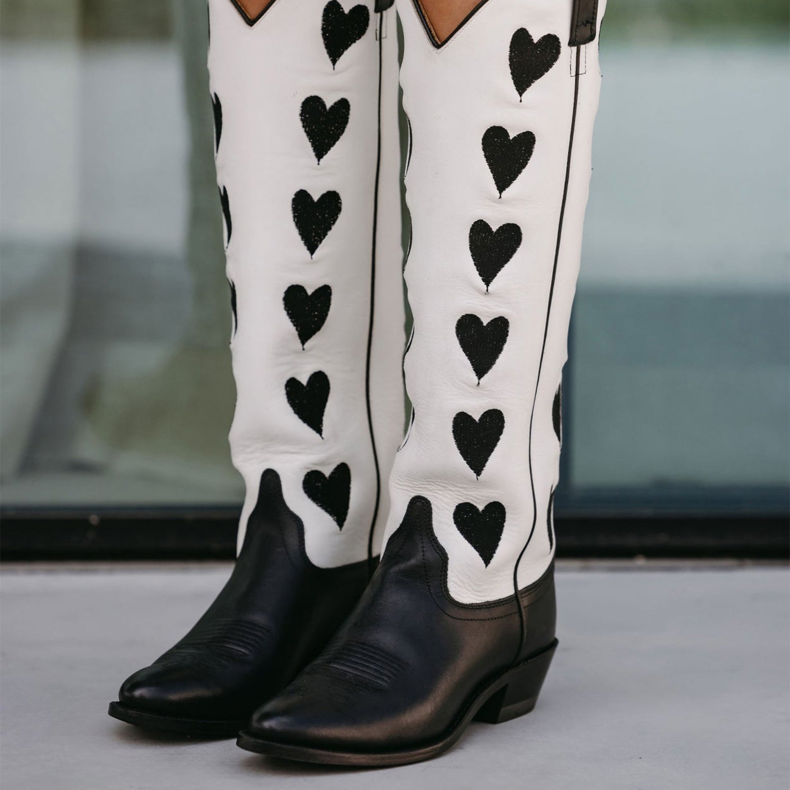 Contrast White And Black Almond-Toe Hearts Inlay Wide Calf Knee High Cowgirl Boots.