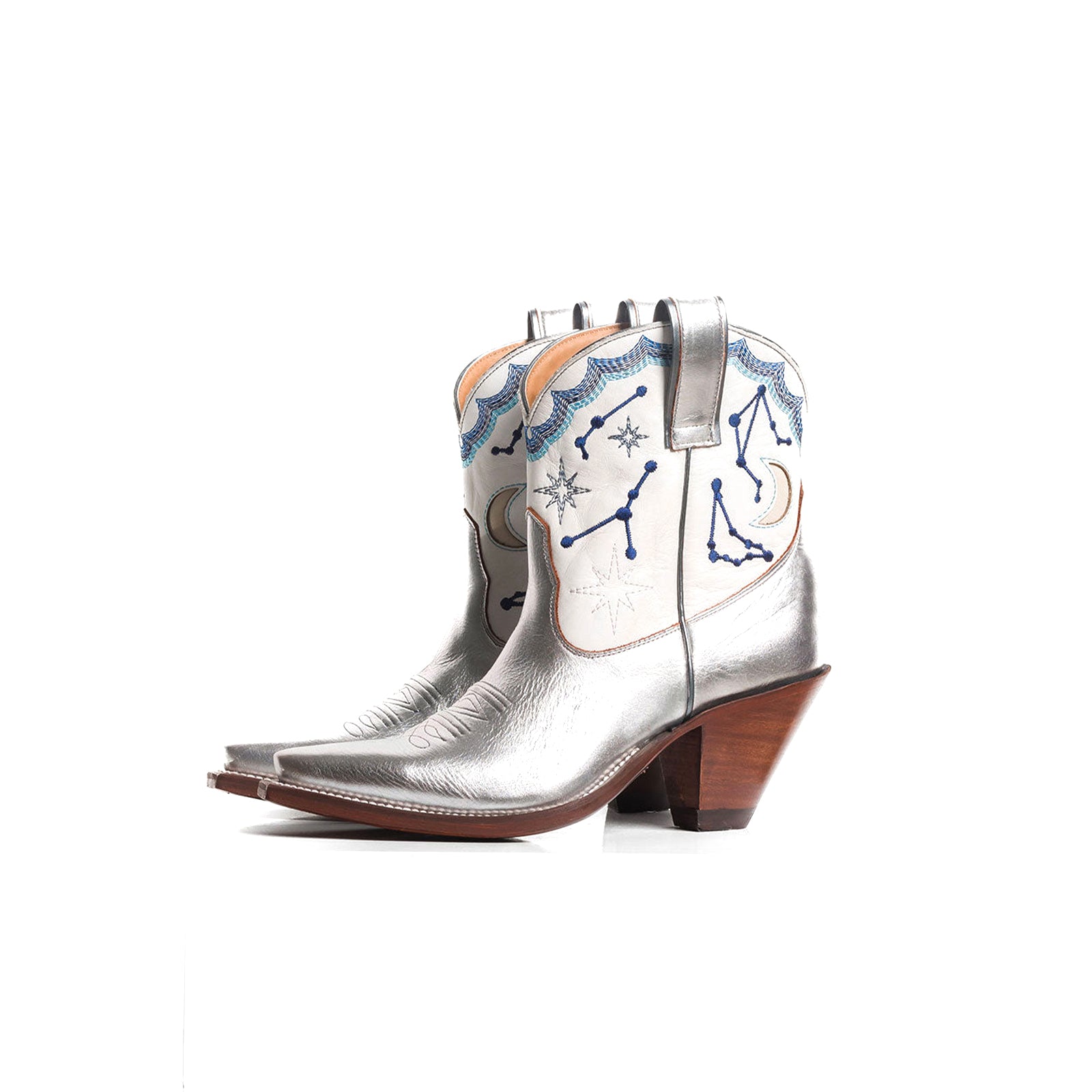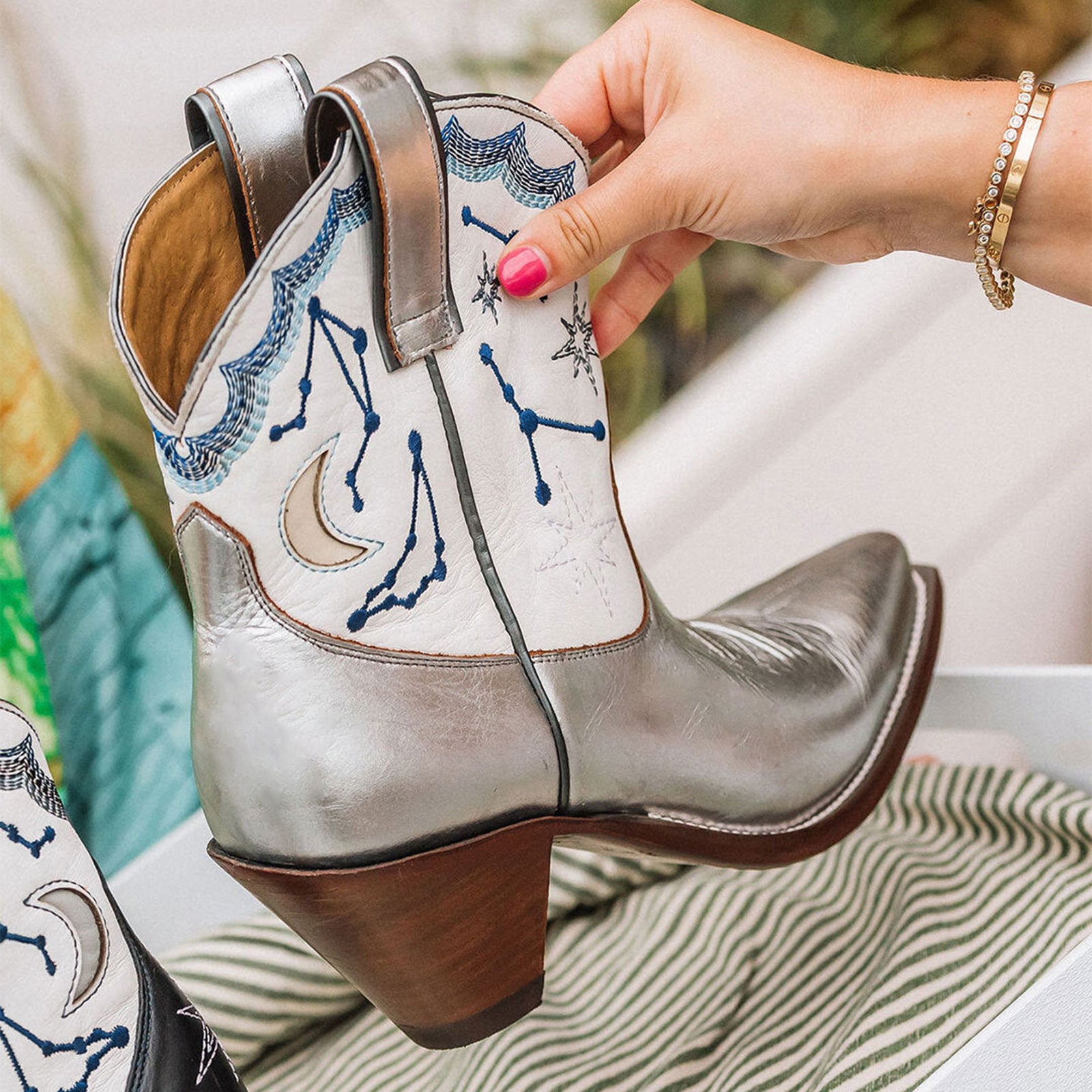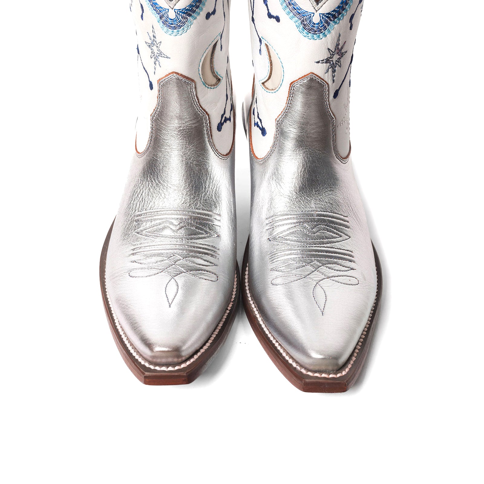 Contrast White And Metallic Silver Snip-Toe Cosmic Embroidery Moon Inlay Ankle Cowgirl Boots.