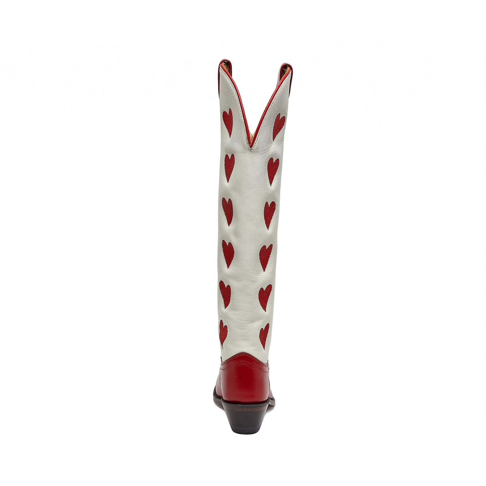 - Striking contrast of white and red with heart-shaped inlay detailing for a bold Western look.