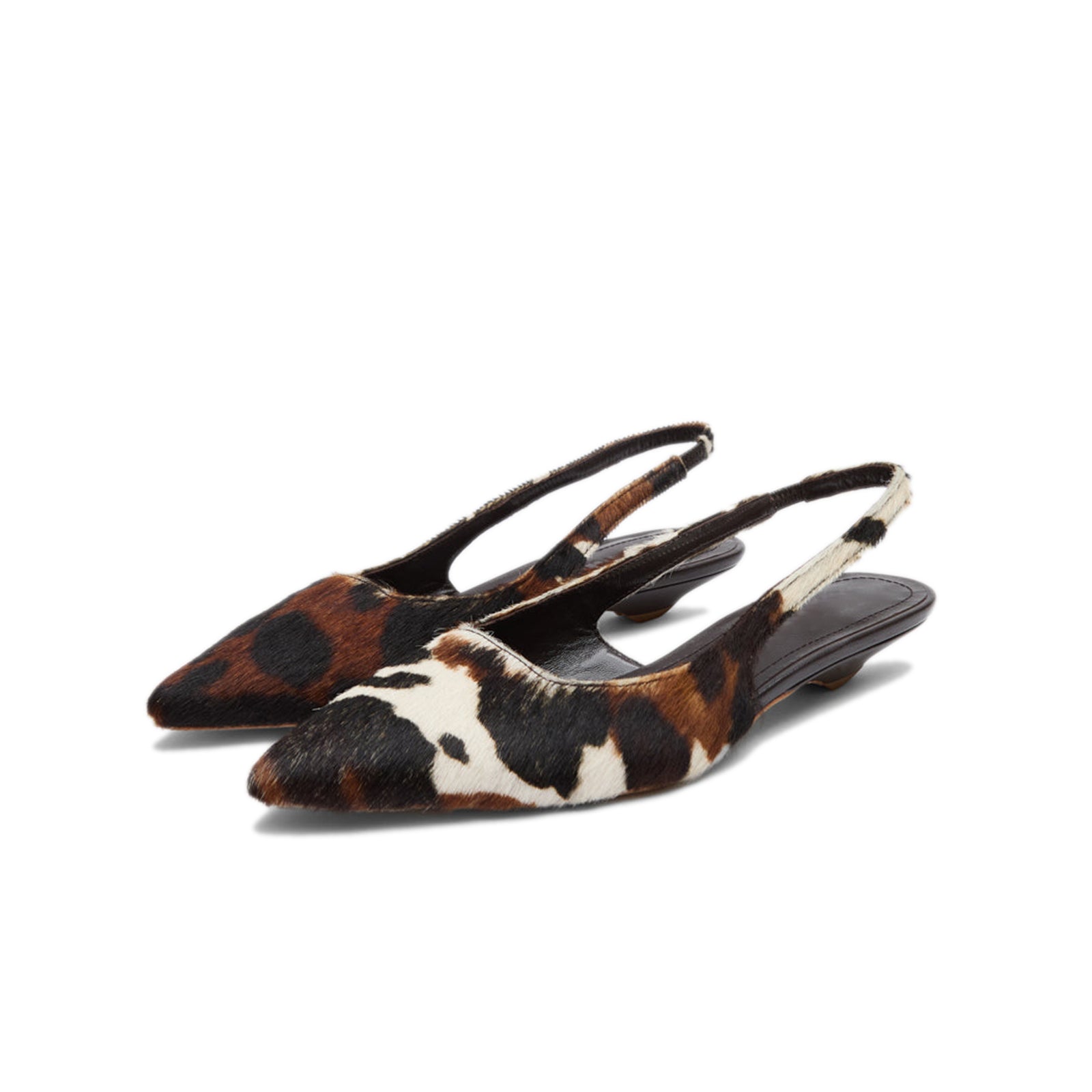 Cow Print Pony Hair Pointed-Toe Classic Slingback Kitten Heels.