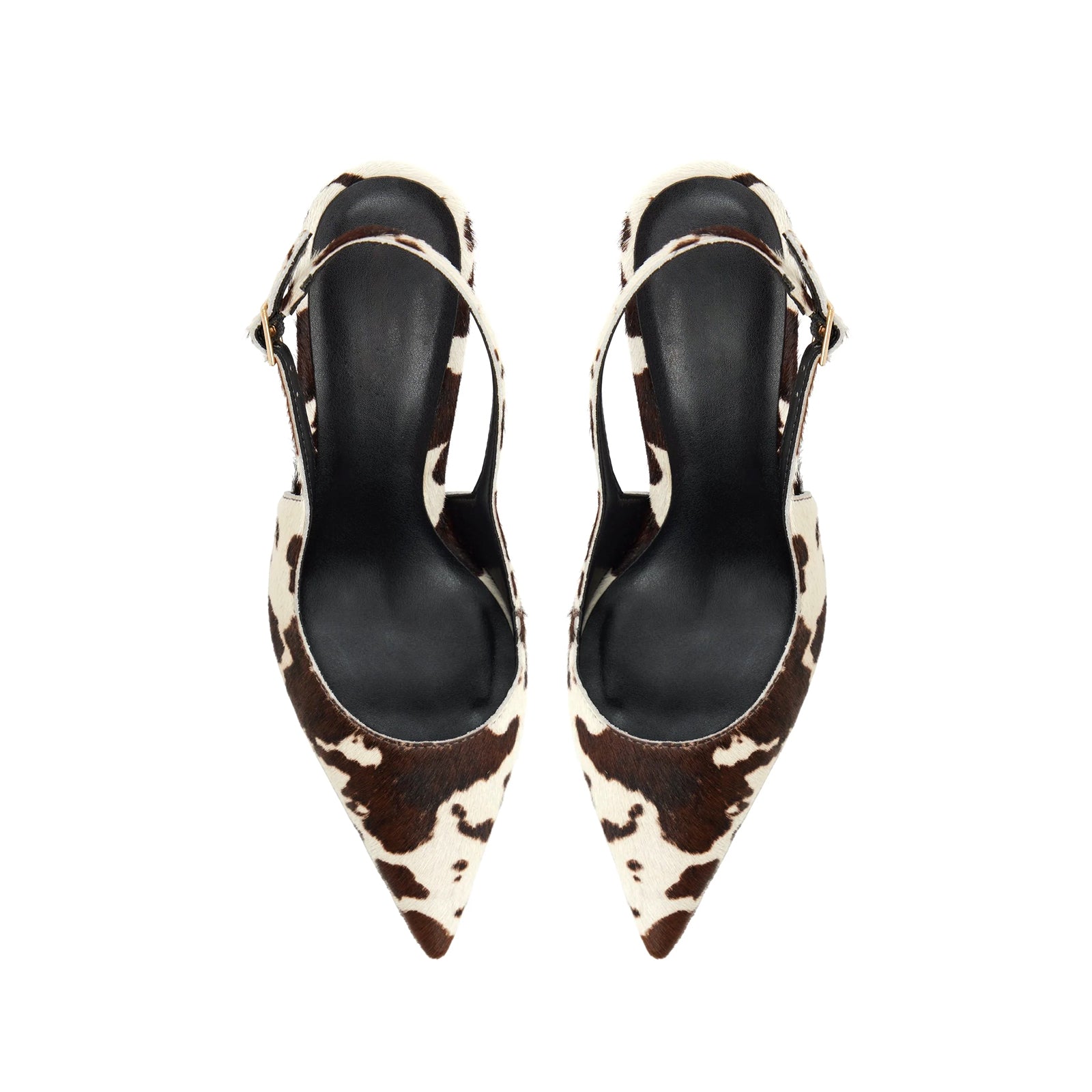 Cow Print Pony Hair Pointed-Toe Slingback Kitten Heels.