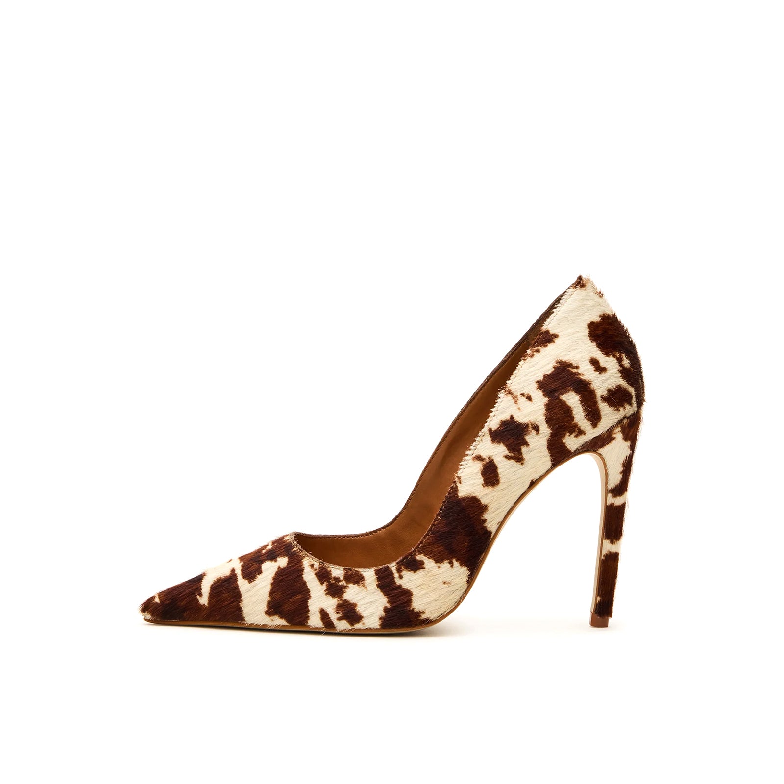 Playful yet striking, these heels bring bold cow print texture to a sleek pointed-toe silhouette, blending rustic charm with modern sophistication.