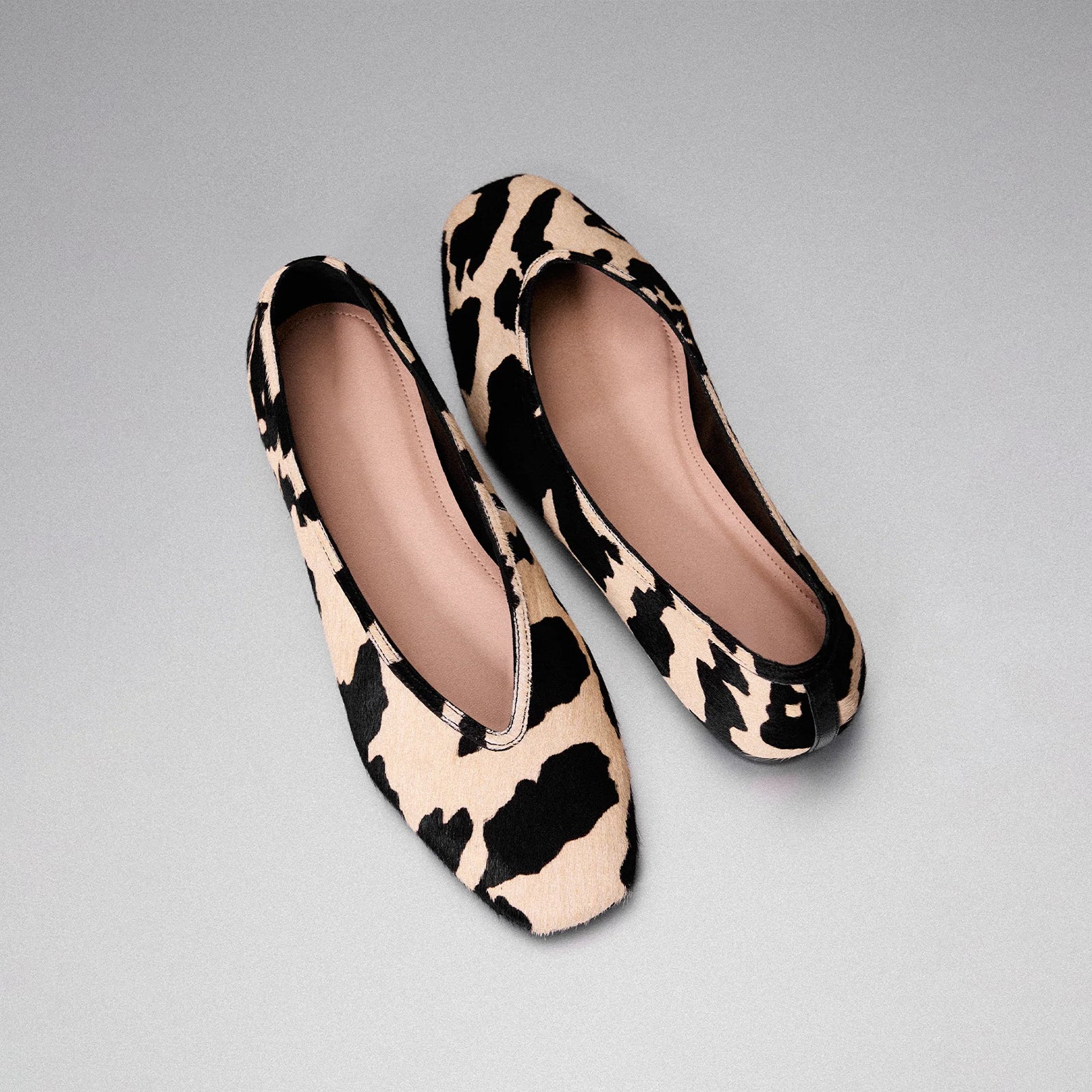 Chic and versatile, these ballet flats combine playful cow print with everyday comfort, making them a standout choice for casual elegance.