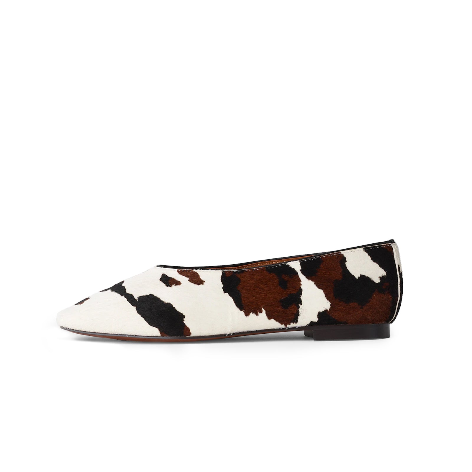 Cow Print Pony Hair Vegan Leather Square-Toe Ballet Flats.