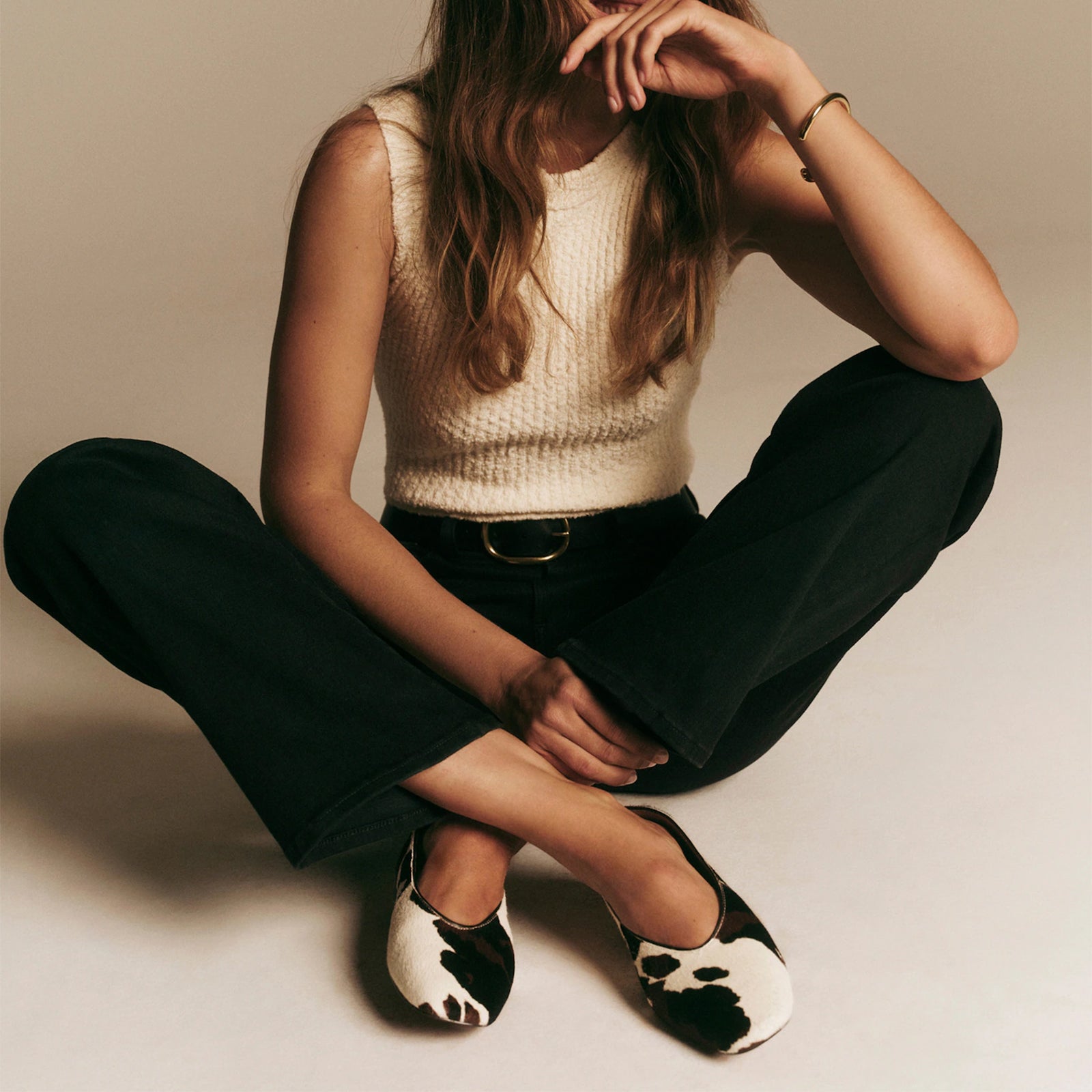 Playful and bold, these ballet flats stand out with a cow print pony hair finish, blending rustic charm with modern everyday elegance.