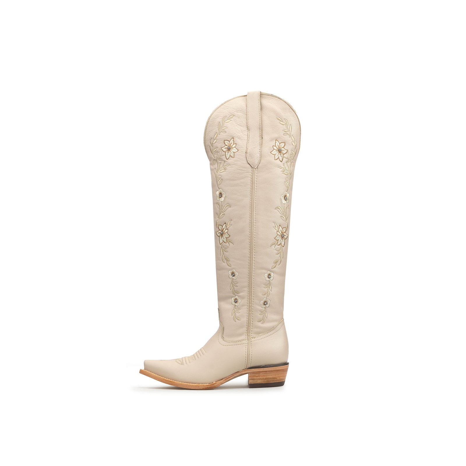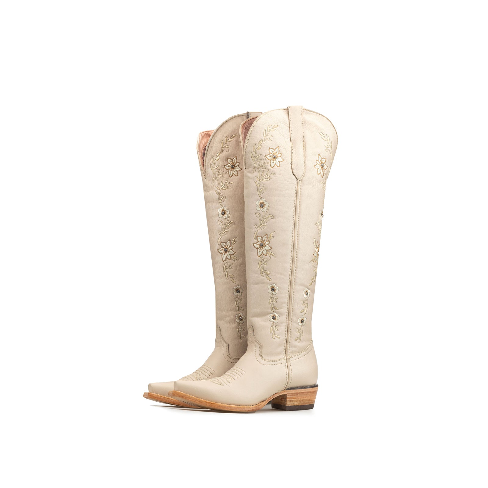 Cream Snip-Toe Flower Embroidery Rhinestone Half-Zip Knee High Cowgirl Boots