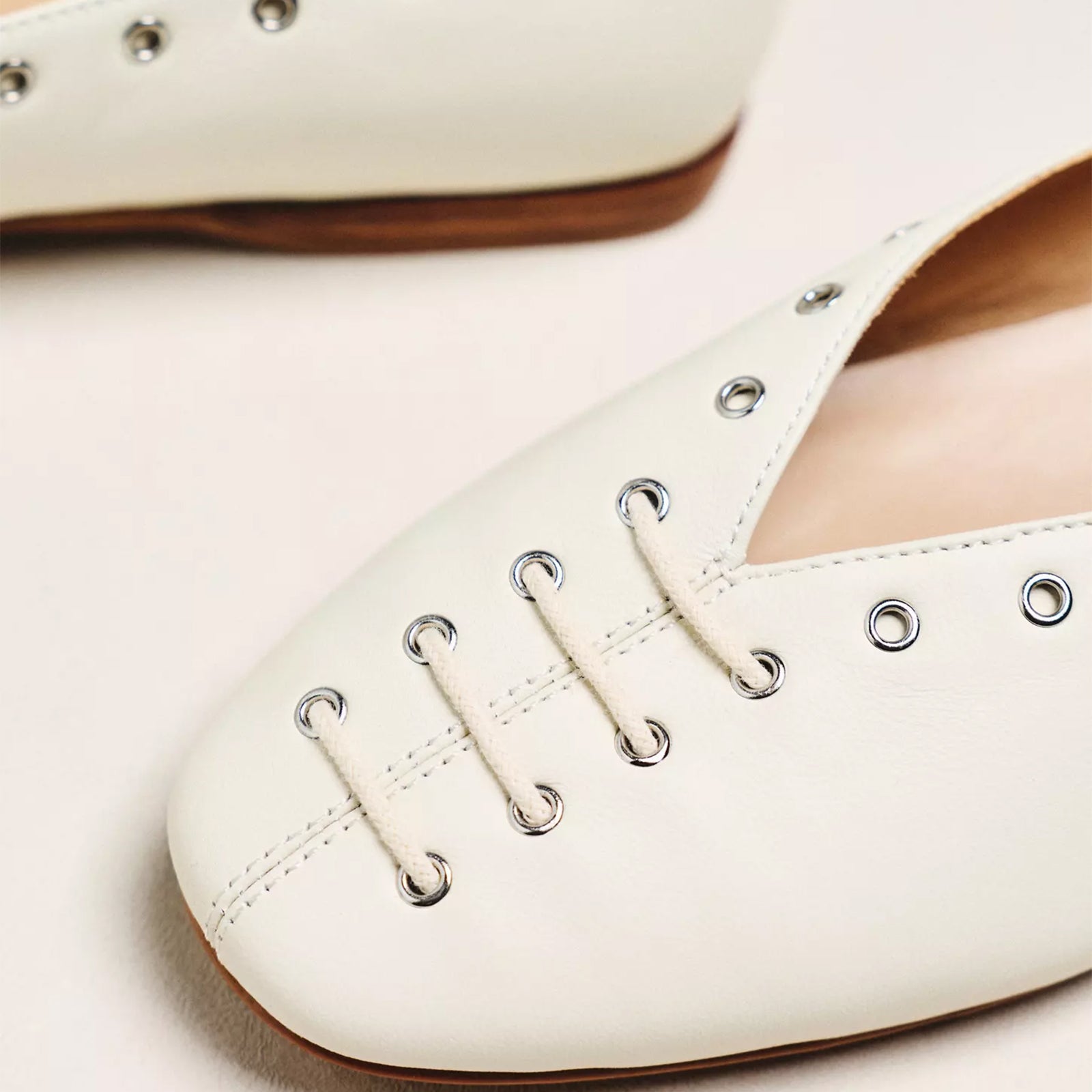 Cream Square-Toe Grommet Lace-Up Ballet Flats.