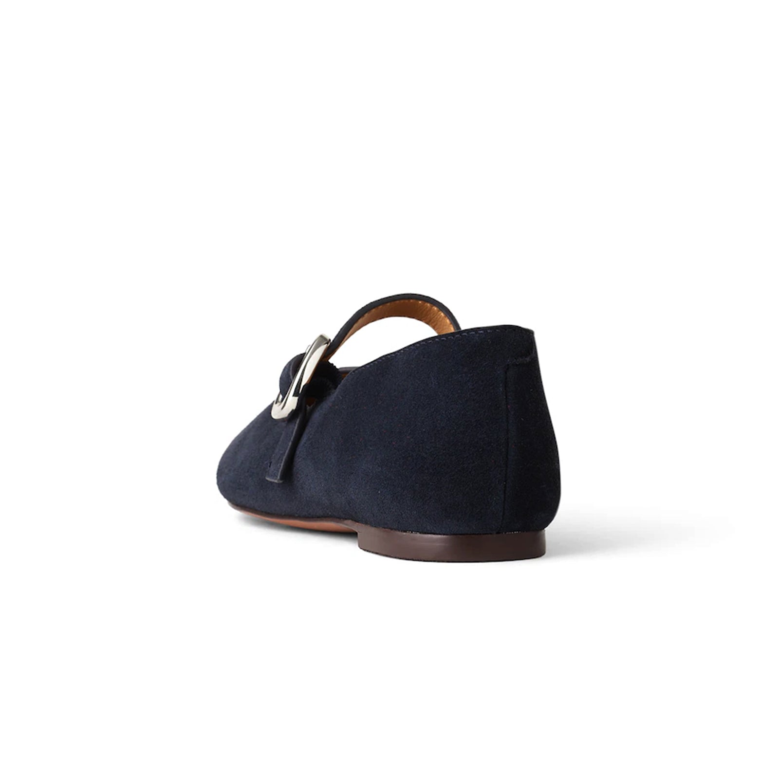 Dark Blue Faux Suede Round-Toe Buckle Bridge Strap Slip-On Flats.