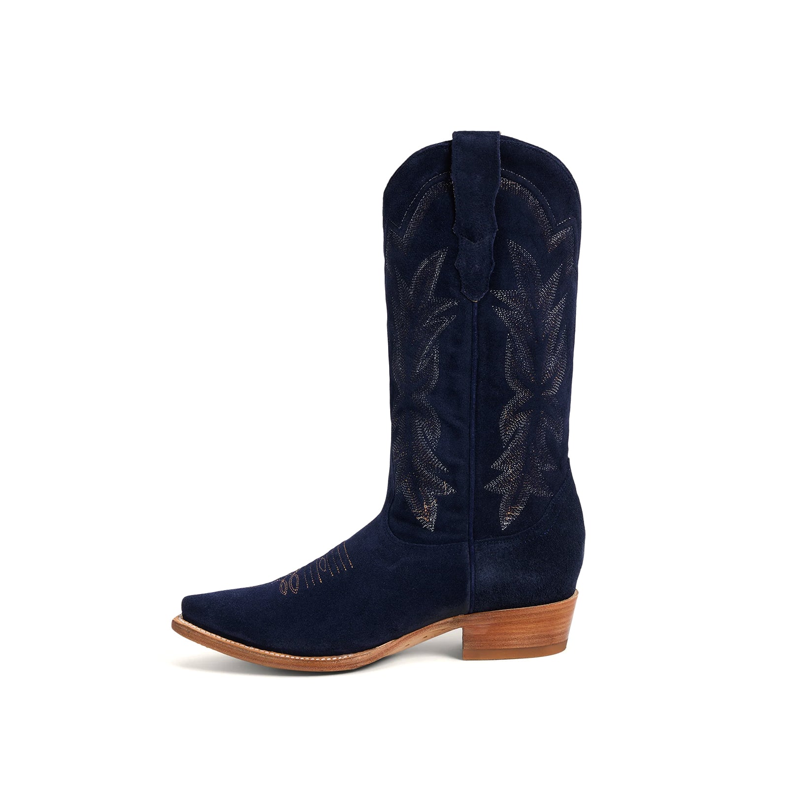 Dark Blue Faux Suede Snip-Toe Embroidery Mid Calf Cowgirl Boots