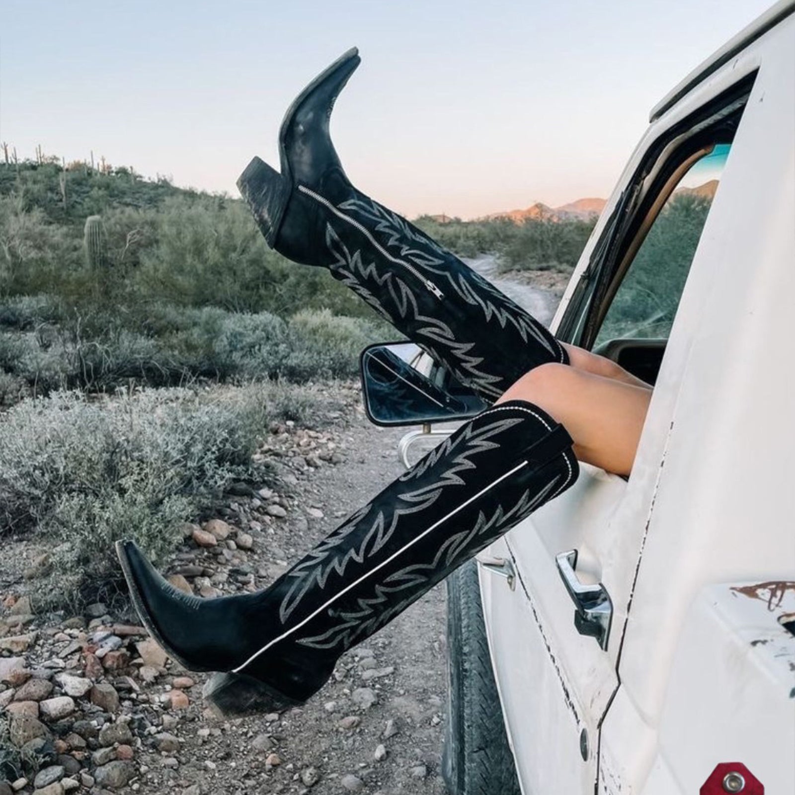 Classic Western charm meets modern edge in these dark green boots, offering bold color, timeless embroidery, and a confident knee-high cut.