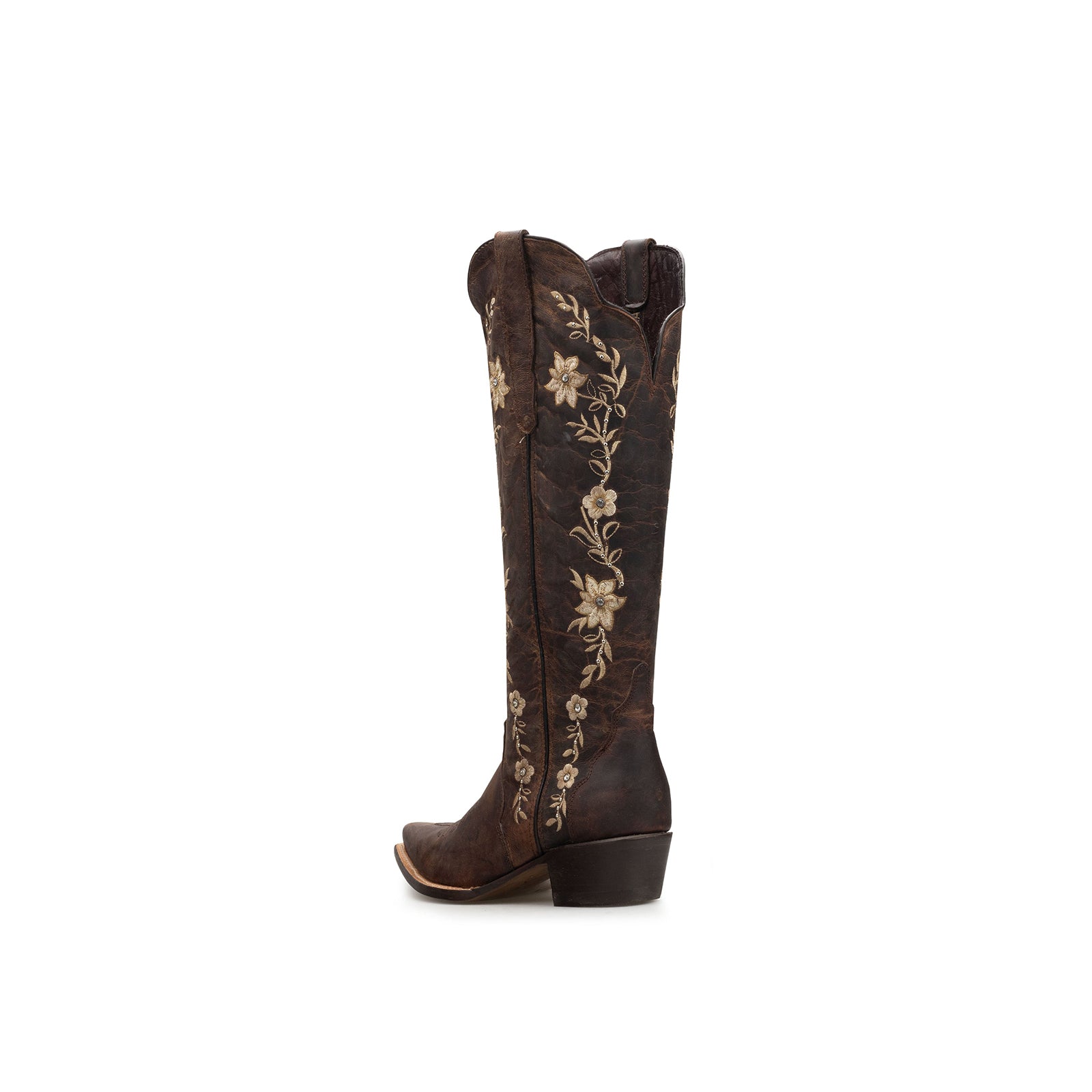 Distressed Coffee Snip-Toe Flower Embroidery Rhinestone Studs Wide Calf Knee High Cowgirl Boots.