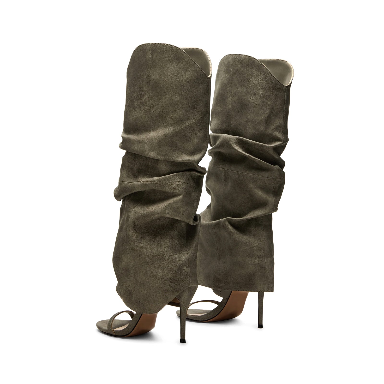 Gray Open Round-Toe Fold-Over Wide Calf Knee High Stiletto Boots.